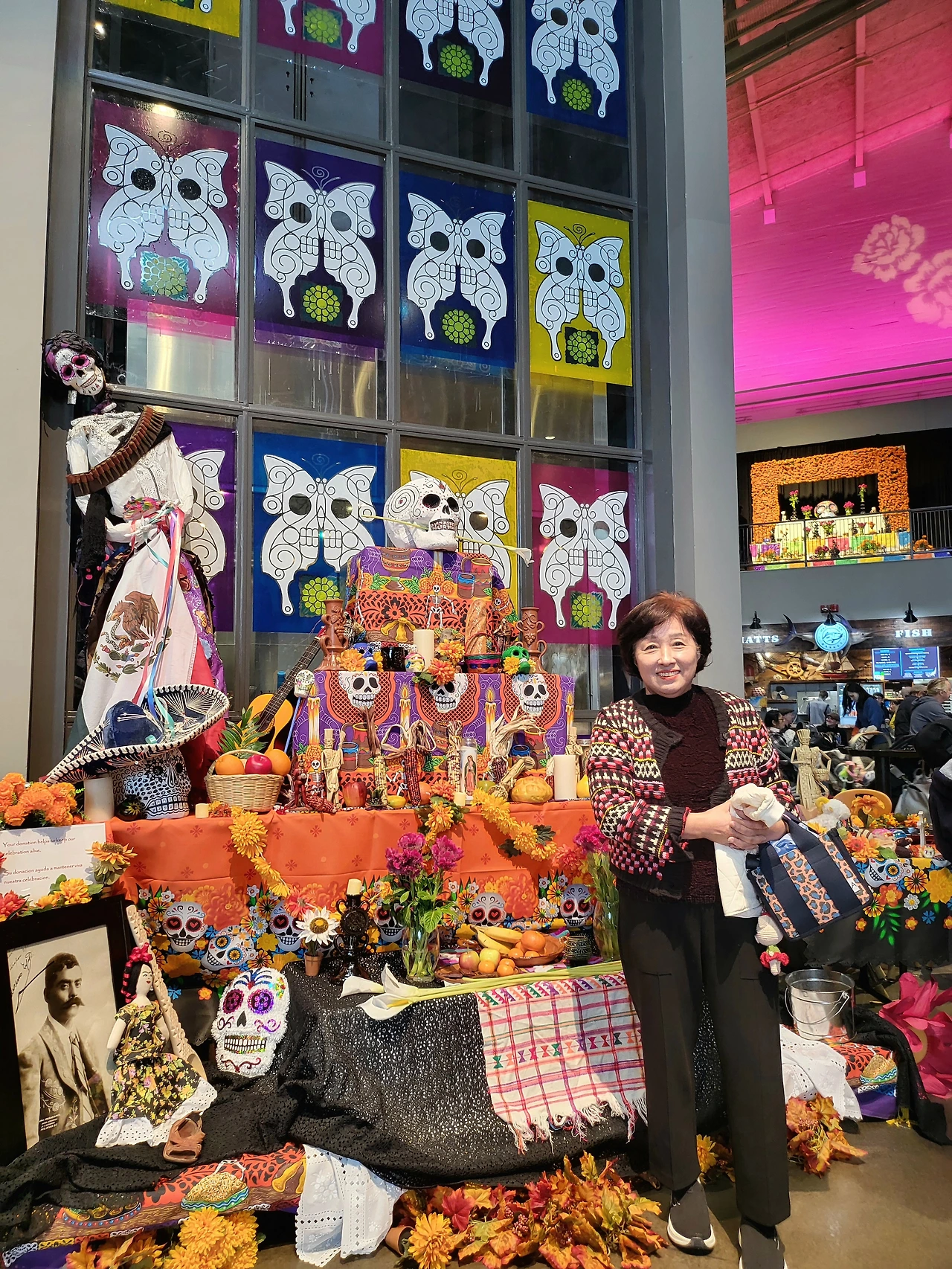 마리아치의 애절한 가락에 취해 광장을 둘러보니 아름답게 장식된 오프랜다(우리의 제사상과 제사 차림과 유사한)가 ‘코코'에서 보았던 그 모양으로 손님을 맞는다. 누군가의 조상일 망자들의 사진과 그 사이사이를 채운 황금색 금잔화, 멕시코의 상징인 옥수수, 각종 과일과 꽃, 빵, 다양한 모양의 설탕 해골장식과 화려한 색종이 가랜드(파펠 피카토)들. 살아있는 나의 눈에도 이렇게 아름다운데 돌아가신 조상님들은 얼마나 기분이 좋을까.
