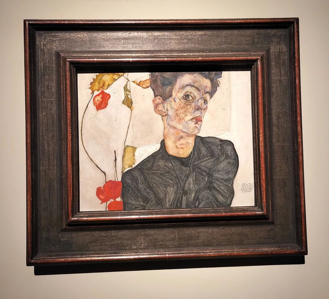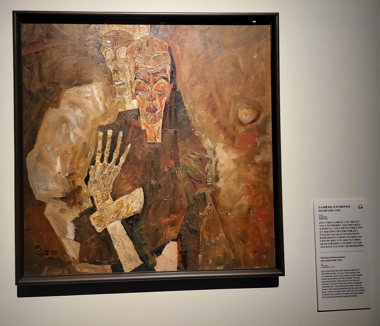 화려하고 사치스럽고 몽상적인 클림트와는 달리 에곤실레의 작품은 다소 기괴하고 비틀어졌으며 직설적이고 통렬하다. 턱을 살짝 들고 눈을깔아 다소 거만한 듯 내려보는 그의 자화상은 그 자체로 관객들에게 시비를 거는 모습이다.
