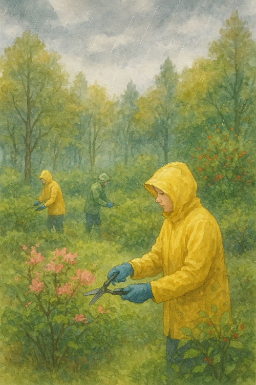보기엔 야멸차게 보일지도 모르지만 머리카락을 잘라주듯 숲정원도 관리해 줘야 건강한 숲이 된다. 관목들은 다듬어주고, 나무들은 가지를 잘라 공기가 통하게 해줘야 한다. 오늘 숲정원에서 보슬보슬 내리는 비를 맞으며 도시숲 실습을 했다. 숲은 사람의 손길을 기억하고, 우리는 그 숲을 통해 다시 숨을 돌린다. 오늘 나는 도시숲 119 요원이 되어 숲에 숨을 불어넣었다.