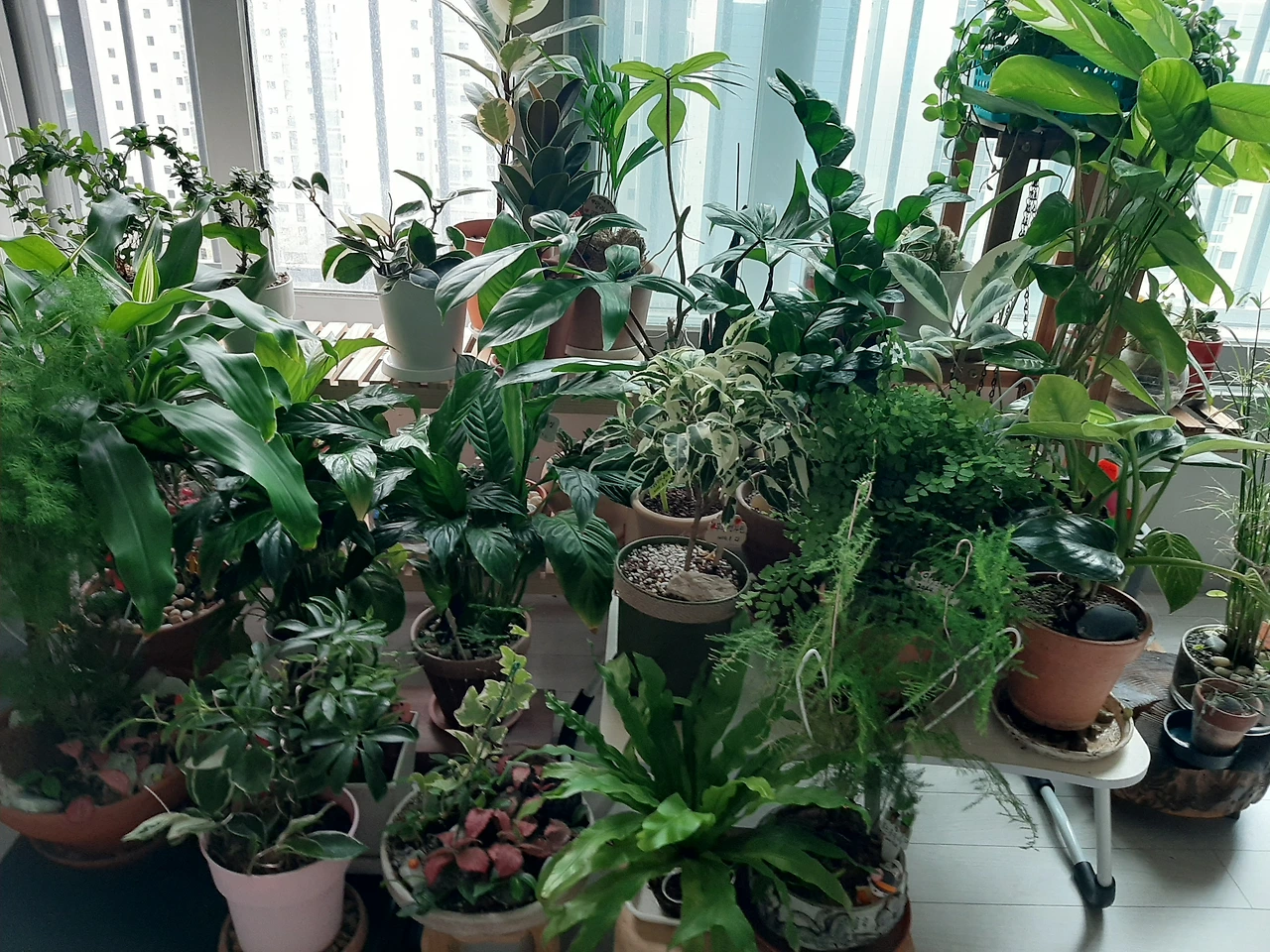 앞쪽에는 야트막한 진열대 위에 행운목과 스파트필름 화분 두 개를 얹었다. 화분 진열대를 구입하는 대신에 올겨울도 공부상을 대신 사용해보기로 한다. 작은 상위에 플로리다 뷰티, 금전수, 무늬벤자민, 크테난테, 이디안텀 화분을 올렸다. 베란다에 있는 화분들도 몇 개 들고 와서 공간을 만들어본다. 더 추워지기 전에 베란다에 있는 화분들을 거실로 들여야 할 텐데 고민하는 아침이다.