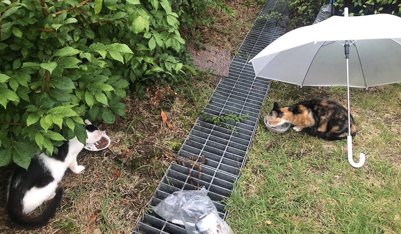 뙤약볕을 피하려 들고 있던 양산을 내려놓고 부지런히 둘의 먹거리를 꺼낸다. 먼저 사랑이의 연어 파우치와 캔을 따 그릇에 부어준다. 한 번에 두 개를 줘야 제 엄마 아롱이 밥에 덤비지 않는다. 사랑이는 제 언니 아로처럼 연어를 좋아한다. 작년에 무지개다리를 건너간 아로의 예쁜 얼굴이 사랑이에게도 엿보인다.