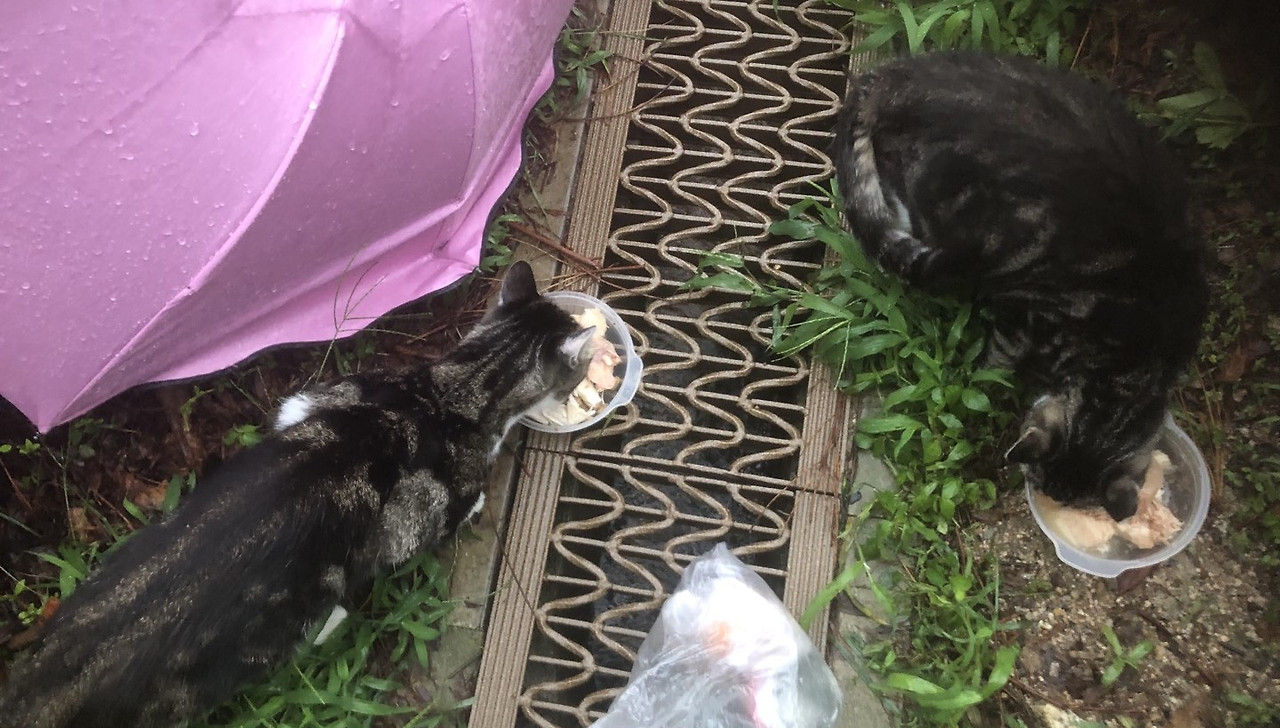 겨울 못지않게 냥이들 밥 주기가 만만치 않은 게 여름이다. 며칠 전 우중에 비탈길에서 미끄러진 덕에 아직도 오른쪽 팔에 통증이 있다.