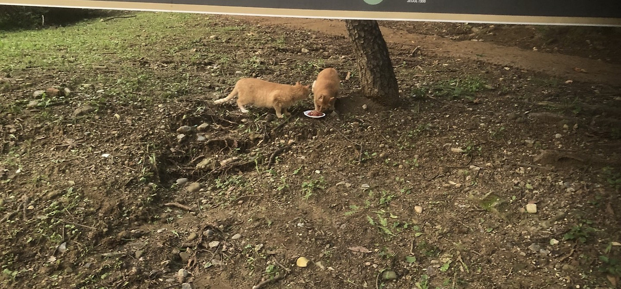 문제는 또 있다. 나도 밥을 먹어야 한다고 주장하는 녀석들이 나와 자꾸 눈을 맞춘다. 그릇을 씻으러 음수대에 가면 치즈 냥이가 나무 아래 기다리고 있다 벌떡 일어나 다가온다.