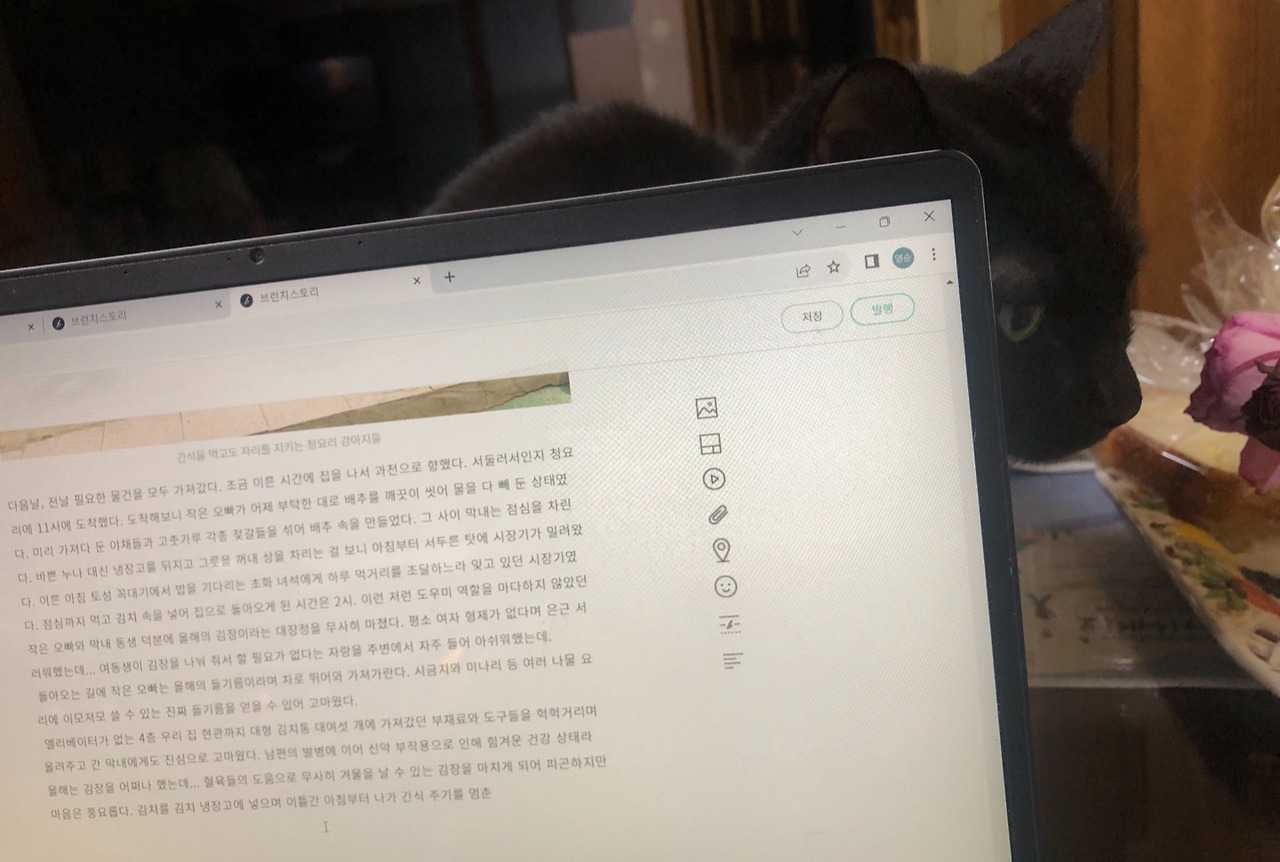 이틀간의 김장 여정을 정리하는데 까미가 식탁 위까지 뛰어 올라오더니 까만 발을 전원에 슬쩍슬쩍 들이밀며 자꾸 방해질이다.