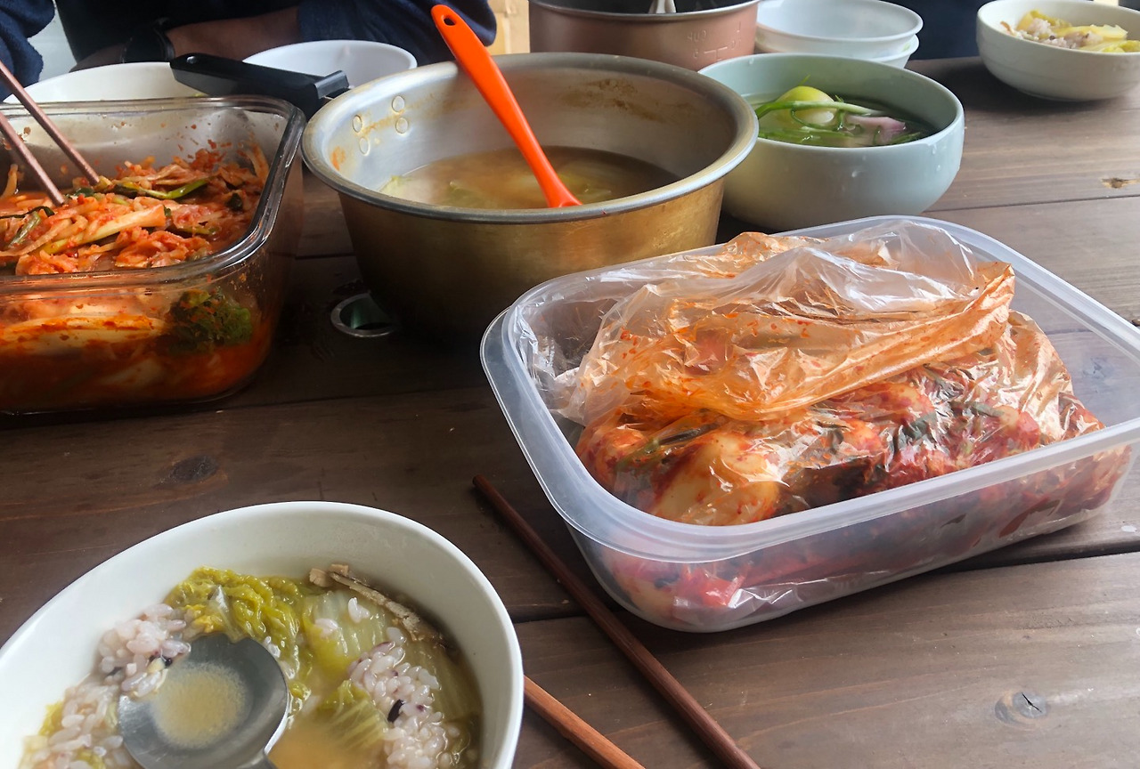 막내와 내가 도착하기 전 배추와 무를 뽑아 다듬어 놓고 배춧국을 끓이고 밥도 새로 해서 꺼내 놓는다. 밥에는 내가 좋아하는 콩이 듬뿍 들어 있다. 제법 먼 길을 온 동생들이 분명 배고플 거라고 생각해 준비한 모양이다. 심지어 직접 동치미를 담갔다며 먹어보라고 권한다. 야외용 그릇들이라 어수선하고 김치들도 통째로 내놓았지만 모두 맛이 좋았다..
