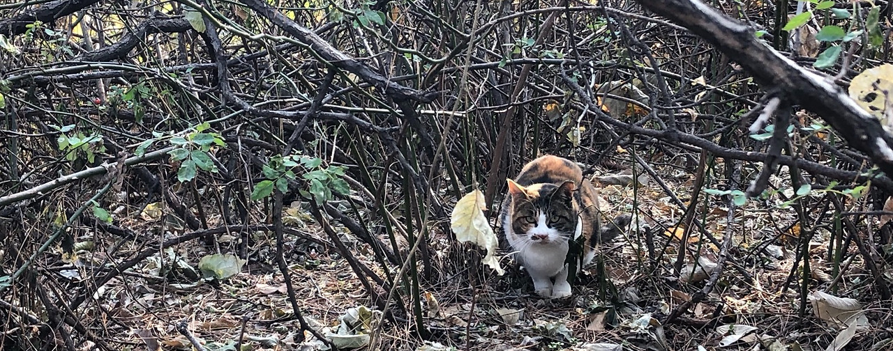 그 장소는 찔레나무가 여기저기 자란 덤불숲이다. 조금만 잘못 움직여도 찔레 가시에 손이 찔린다. 옷도 걸려 뜯겨나가 아주 조심해 다녀야 한다. 그런데도 다른 냥이들 눈을 피해 초화에게 밥을 먹일 최적의 장소였는데.