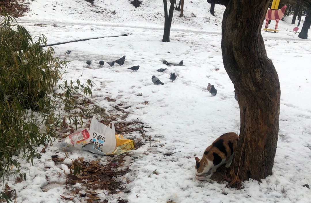 귀요미와 다롱이가 있는 곳에 가니 눈 때문에 먹이를 구하지 못한 비둘기와 까치들이 나를 알아보고 떼로 날아든다. 너나없이 겨울을 나기 힘들어 보인다.