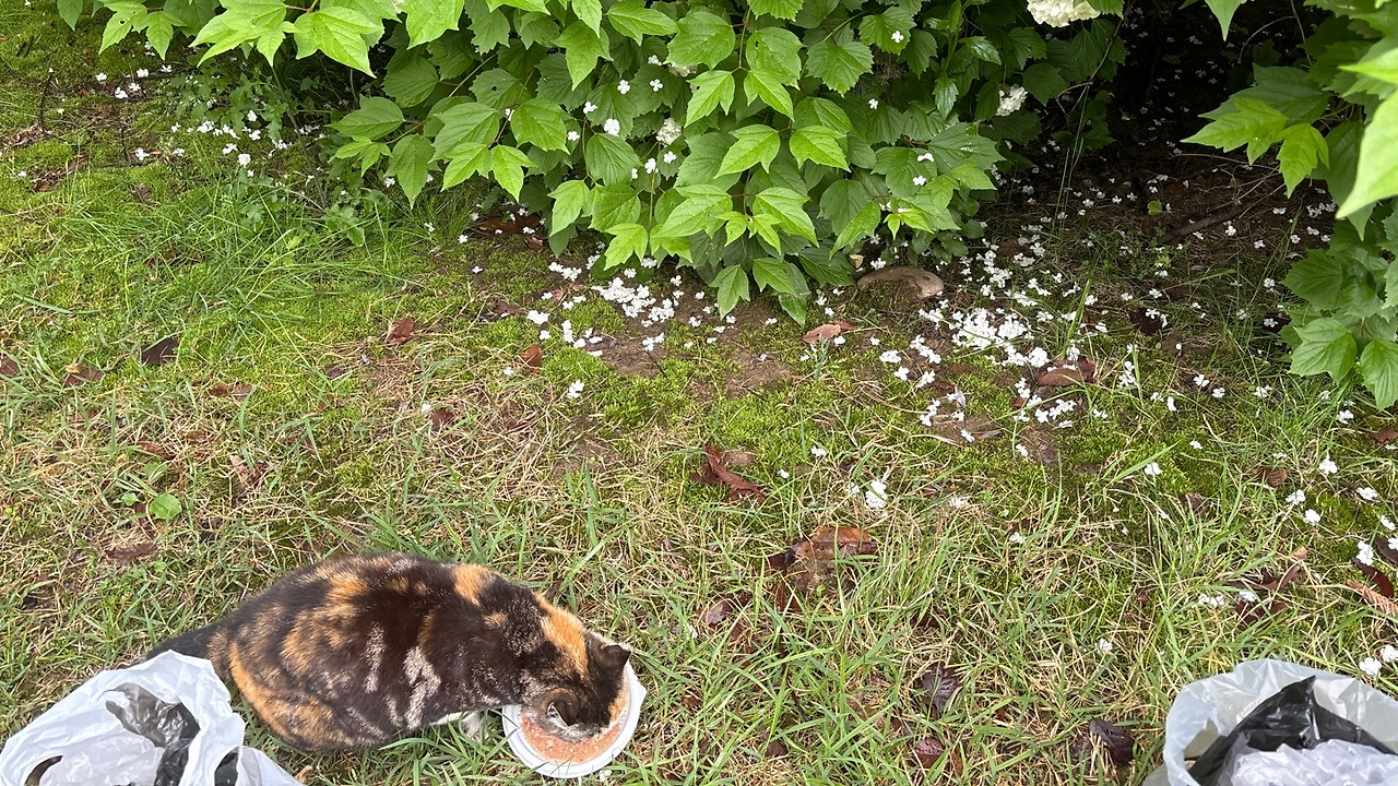 아롱이가 다행히 주차장 근처 야트막한 둔덕에서 기다리다 반색하며 뛰어왔다. 비가 와 사람들 출입이 적긴 하지만 아무도 보이지 않는 수국 나무 아래로 데려가 밥을 먹였다. 아롱이를 쉽게 찾으니 묵직했던 마음이 조금 덜어지는 느낌이다. 친구에게 다녀오느라 밥을 먹이러 오는 시간이 늦어졌다. 귀요미와 다롱이도 찾아 먹이를 다 먹는 것까지 보고 돌아섰다.