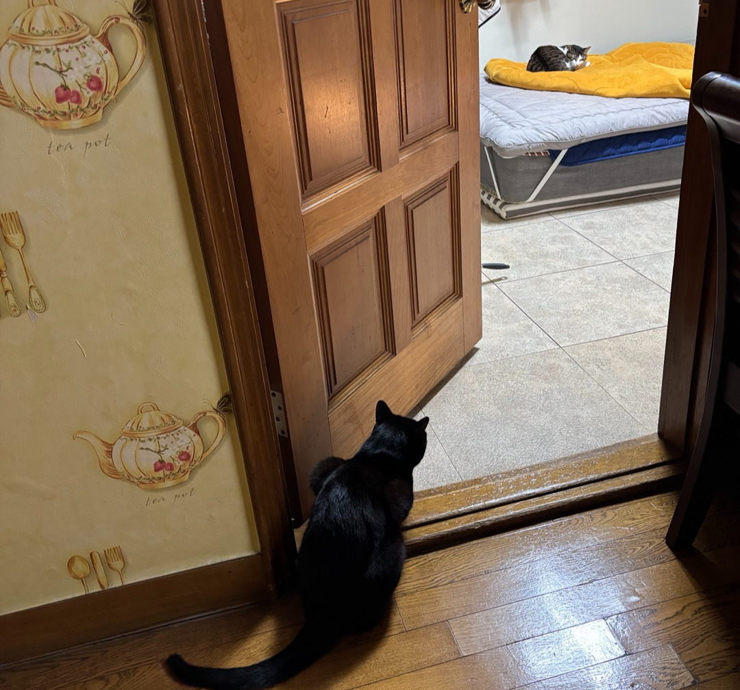 분명 경대에서 '툭'하고 뭔가 떨어지는 소리가 들렸다. 까미는 배가 고프면 그런 방식으로 아무 때나 나를 깨운다. 나리가 있는 방 문을 열어두려면 까미는 안방에 두고 문은 닫아 둬야 한다. 교대로 열어주지 않으면 나리 있는 방으로 슬그머니 들어가 때리려(?) 들기 때문이다.