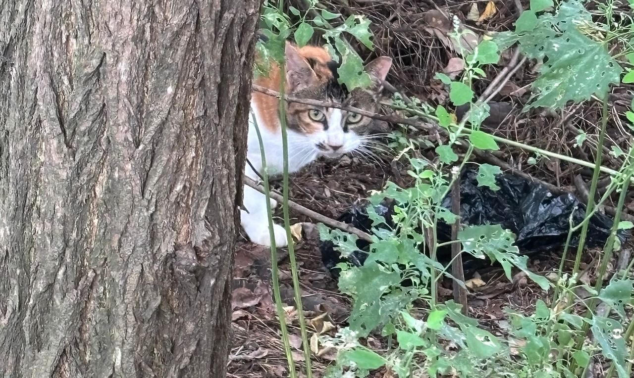 잡목림 속에서 삼색이가 왔다 갔다 뛰어다니며 나를 반겼다. 반색을 하며 가까이 가 먹이를 주려는 나에게 하악질을 해도 반가웠다. 녀석을 만나면 주려고 닭가슴살과 캔을 가방에 챙겨 다녀 다행이었다.