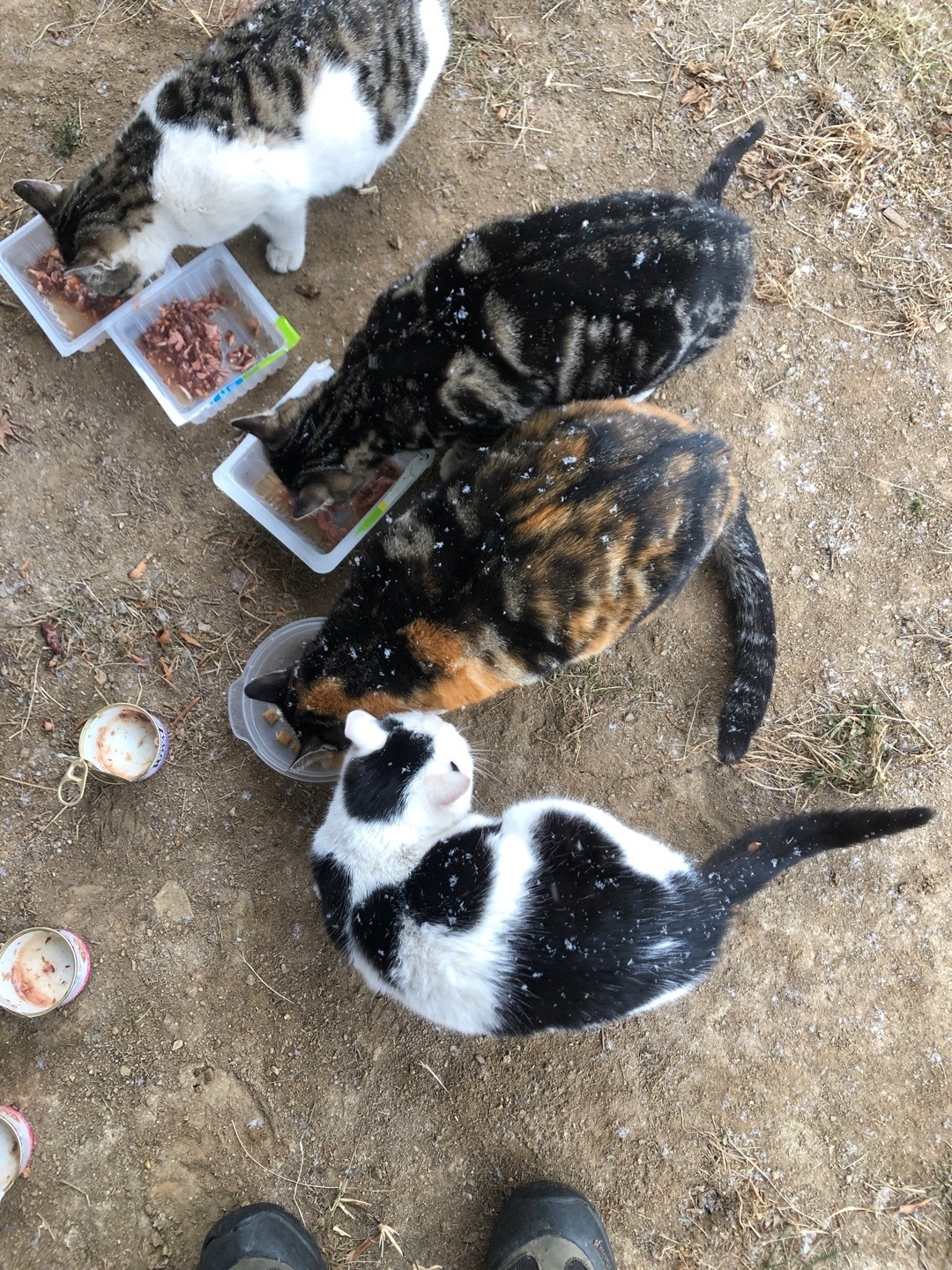 애들이 어인 일로 고양이 집에서 뛰어나왔다. 추웠던 모양이다. 체감 온도 영하 20도를 오르내리니 대안이 없었을 것이다. 하수구 은신처도 강추위를 피하기에는 역부족이었는지 그렇게 들어가 자지 않던 집에서 네 마리가 우르르 나온 것이다.