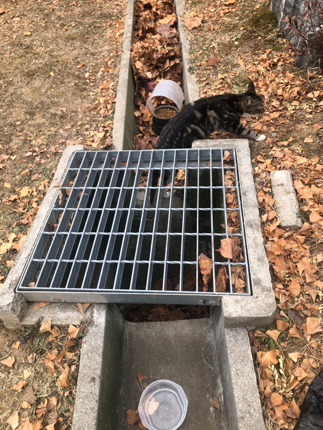 며칠 전 초화지를 지나가다 보니 아롱이 가족들이 사는 곳과 비슷한 배수구 속에 냥이들이 들어가 있는 게 밖에서 보였다. 물은 핑크 뮬리가 겨울에 얼어버릴까 덮어놓은 비닐에 고인 눈이 녹은 걸 가서 먹는다.