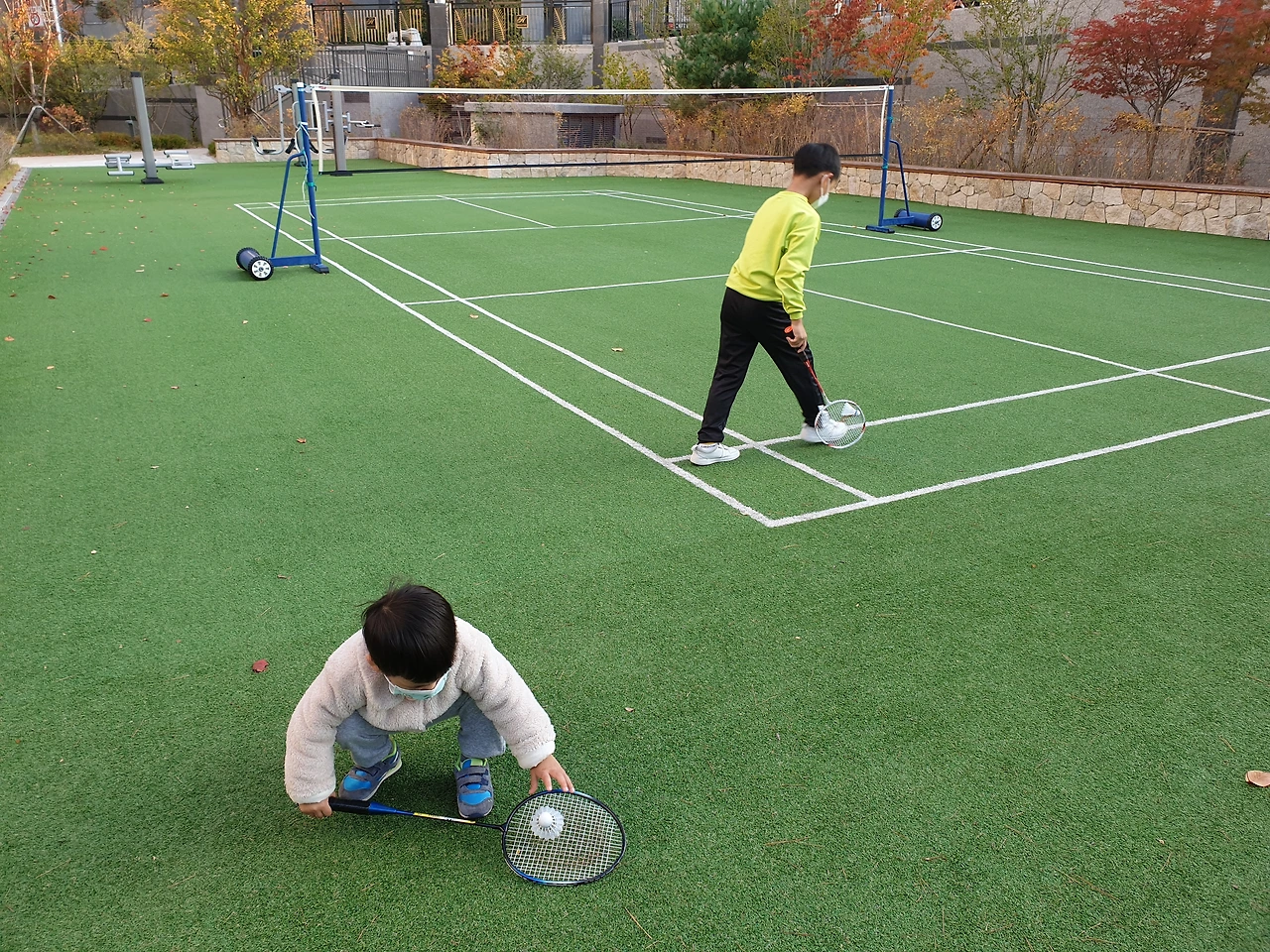 7. 같이 배드민턴을 친다. (2살 동생을 유모차에 태워놓고 배드민턴을 쳤다.)