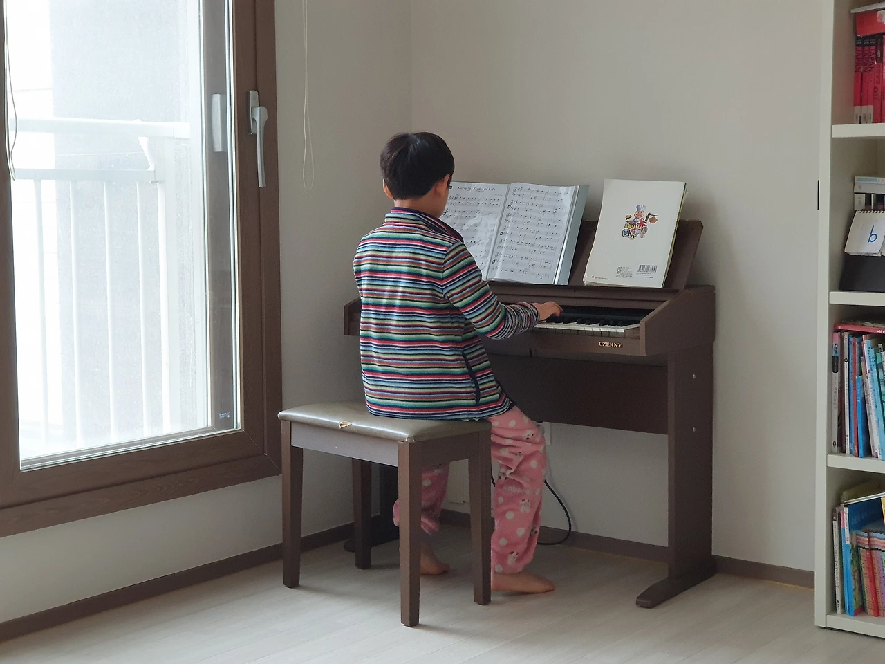 악기는 정말 훌륭한 취미이다. 악기는 손으로 만져서 음악을 만들어내니 재미있기도 하지만 한 악기를 숙달하는 데에는 많은 시간과 인내심을 필요로 하기 때문에 좋은 공부가 된다고 생각한다. 마찬가지로 유치원 시기에 악기를 시작하면 가장 좋은 것 같다. 안타깝게도 첫아이는 그 시기를 놓치고 초등학교 1학년에 시작하려 했는데 코로나 상황이 되며 한 번 더 시기를 놓쳐버렸다. 2학년이 되어 학원에 다녀보자고 했더니 싫다고 고집을 부렸는데 simply piano라는 어플을 다운로드하여 태블릿으로 집에 있던 뽀로로 피아노 장난감으로 쳐본 것을 계기로 방과 후 피아노 수업을 듣게 되었다. 일주일에 두 시간 수업인 피아노는 악기를 숙달하기엔 턱없이 부족하긴 하지만 뽀로로 피아노 장난감을 처분하고 중고로 들인 전자피아노로 매일같이 시간만 나면 악보를 보고 연습하고 쉬운 명곡 악보를 프린트해서 수시로 치면서 즐기고 있다. 수업을 들은 지 한 달도 되지 않아 양손으로 악보를 보며 곡을 치는 것을 보고 방과 후 피아노 수업은 참 가성비 좋은 수업이라 생각했다. 3학년이 되면 피아노 학원을 본격적으로 보내보고 싶은데 아이가 어떤 반응을 보일지 모르겠다. 피아노 치는 아들의 뒷모습을 보는 것은 언제나 흐뭇하다.