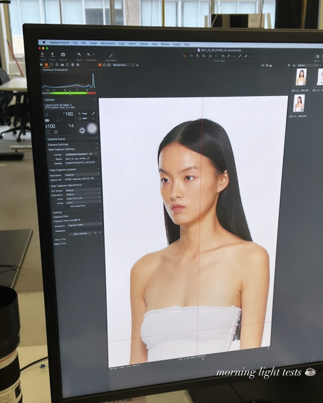 이른 아침에 택시를 타고 몇십 년 전부터 각종 의류 회사들과 공장들이 밀집되어 있는 Chabanel이라고 불리는 거리에 위치한 SSENSE에 도착했다. 내 이름과 정보들을 입력해 출석체크를 하는 태블릿을 거쳐 스튜디오로 향했다. 첫날에는 일단 내 헤어스타일과 메이크업을 정하는 것이 시작이었다. 주로 화장을 안 한 듯 아주 자연스럽고 깨끗한 피부를 연출해 내는 것이 목적이라 단순할 것 같기도 하지만 나를 모든 사진에서 똑같이 보이도록 하는 것이 중요해 꼼꼼하게 시작했다. 머리는 드라이기로 가지런하게 퍼지도록 만들고 귀 뒤로 넘긴 후 양쪽에 몇 가닥씩 튀어나오도록 손가락으로 만져 자연스러운 느낌으로 연출하도록 결정되었다. 얼굴은 몸의 피부톤에 더 가깝도록 어두운 파운데이션을 바르고 자연스러운 음영을 주고 최소한의 눈썹과 입술 화장을 한 뒤 마지막으로는 눈 밑에 약간 어두운 아이섀도를 더하는 것으로 결정되었다. 그리고서 얼굴을 확대해 정면, 옆모습, 뒤에서부터의 옆모습 사진을 찍었다.
