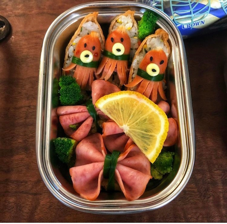 이번 도시락 메뉴는 리락쿠마 유부초밥과 벚꽃 김밥이 메인이다. 그리고 요즘 8세들이 좋아하는 포켓몬 마스터볼과 소시지 병정, 그리고 버터에 구운 새우를 사이드로 준비했다.