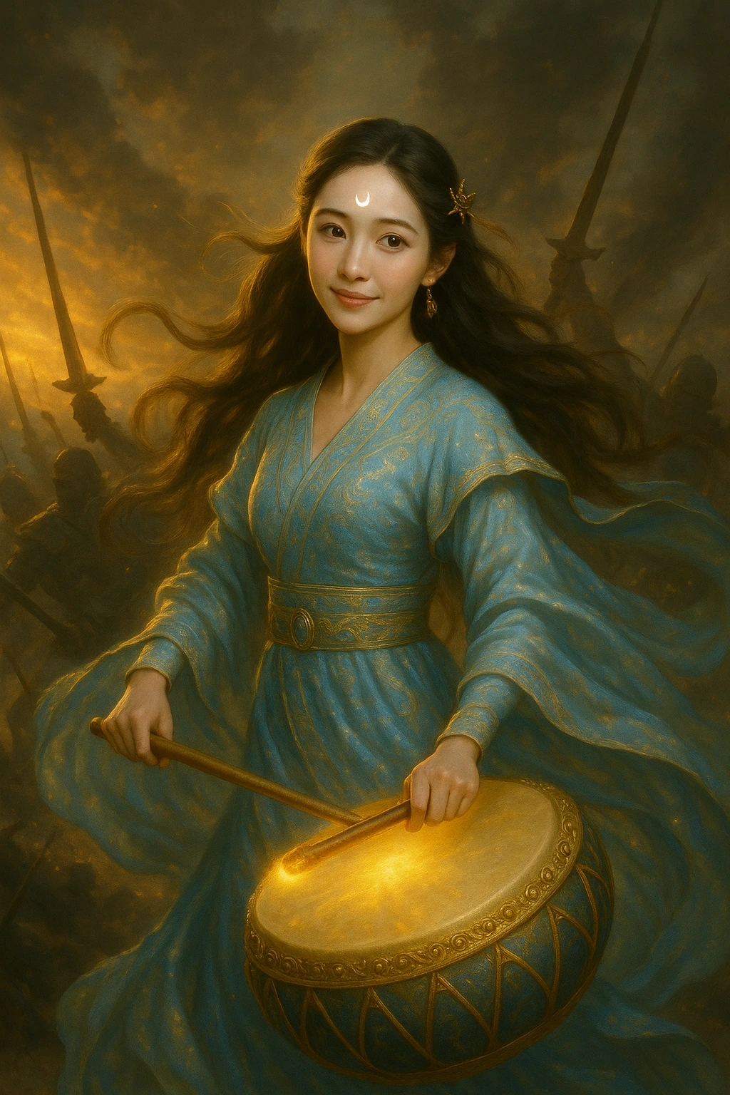 항상 어깨에 가볍게 둘러맨 작은 북, 청혼고,는 그녀의 분신처럼 함께하며, 침묵의 순간에도 미세하게 진동하는 영기의 파장을 발산한다.