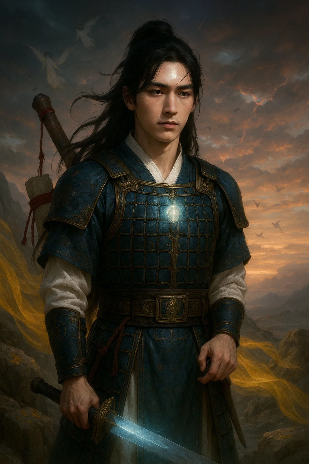 그는 무릎을 꿇고, 보검을 꺾었다.