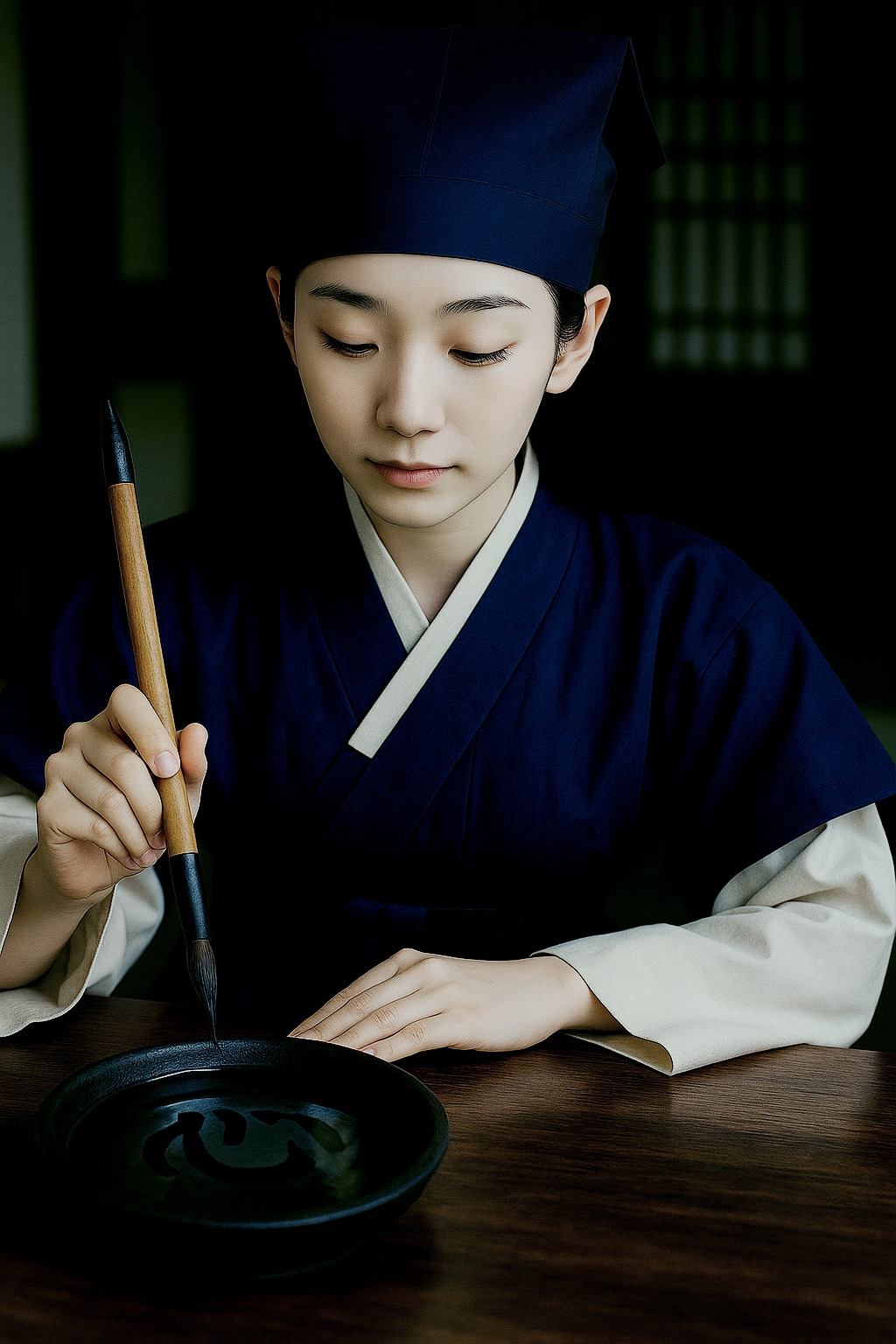 눈은 감겨 있었고, 손엔 붓이 들려 있었다.