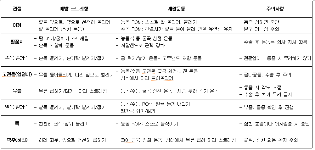또한 운동은 점진적으로 진행해야 하며, 무리한 각도 증가나 과도한 반복은 오히려 손상을 유발할 수 있습니다. 안전한 환경도 필수적입니다. 침상, 의자, 지지대 등을 확보해 낙상이나 사고가 발생하지 않도록 주의해야 합니다.