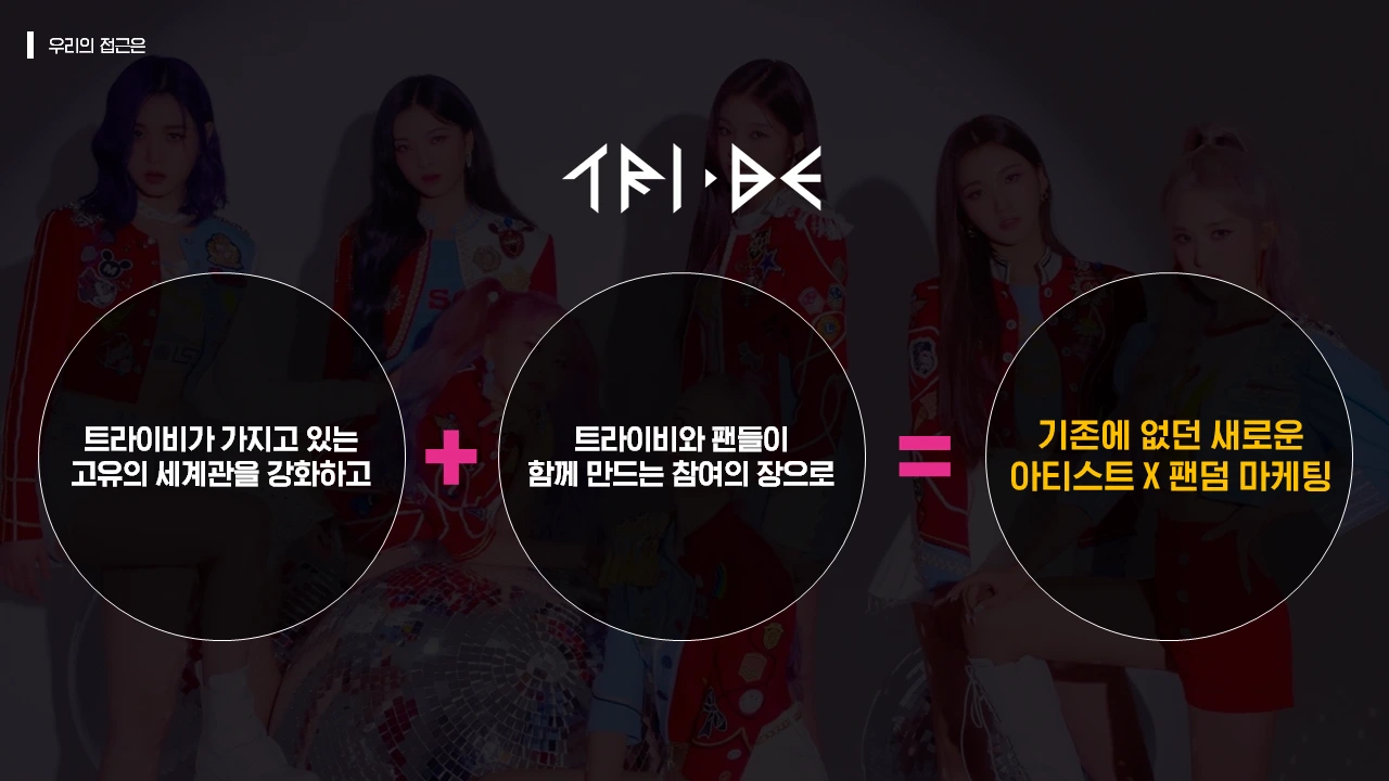 이를 바탕으로 브랜드 X 아티스트 X 팬덤을 연계한 크로스보더 비즈니스로 확대하기 위한 전략을 고민하고 있었습니다. 이런 고민 중에 티알엔터테인먼트의 아이돌 ‘트라이비(TRI.BE)’의 도움으로 팬덤 마케팅 실행을 구체화해볼 수 있었습니다.
