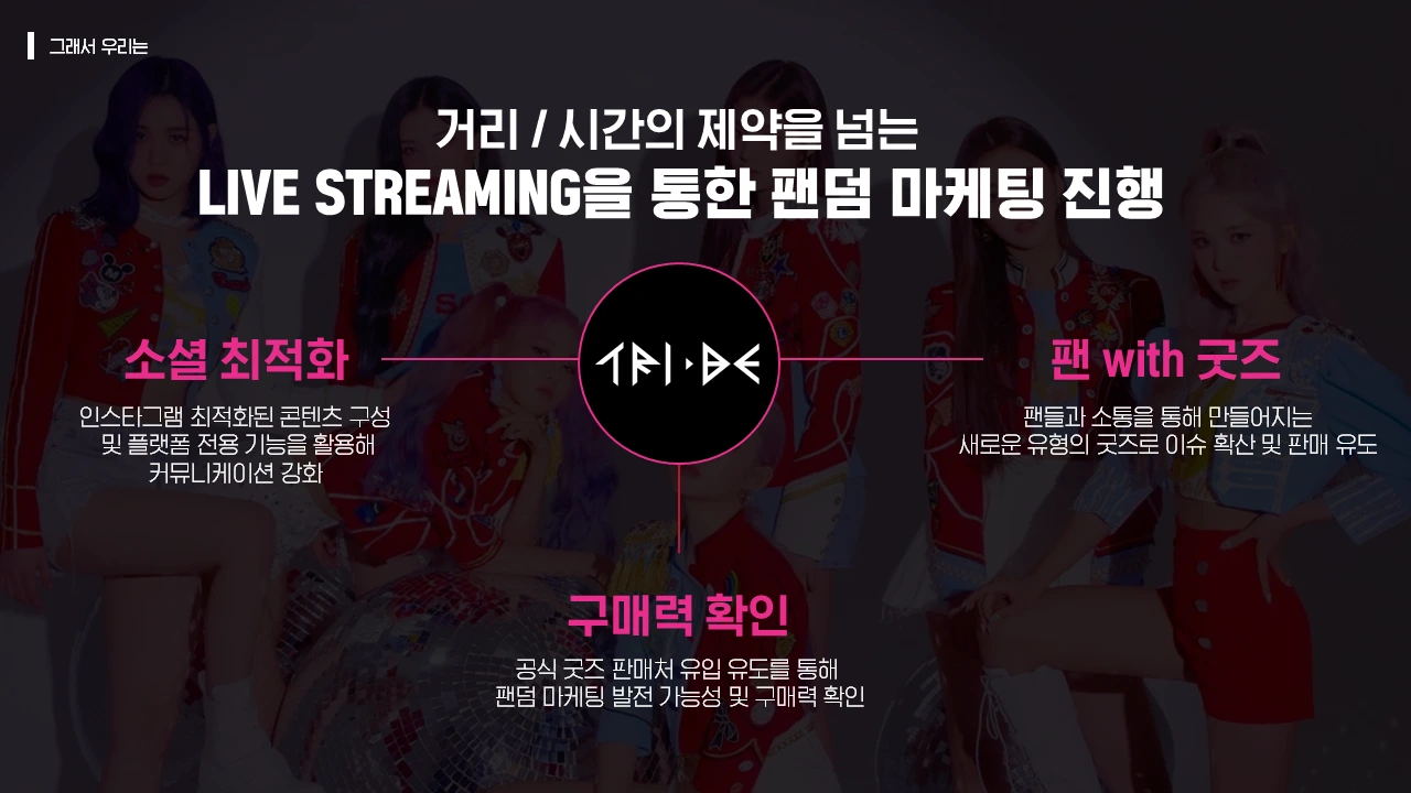 트라이비 고유의 세계관 안에 빈 공간을 팬들과 소통하며 완성하는 일련의 과정을 선사하고 더욱 견고한 팬덤을 만들고, 구매까지 이어지게끔 하는 것이 주요해 라이브 방송의 구성에 더욱 신경을 썼습니다.