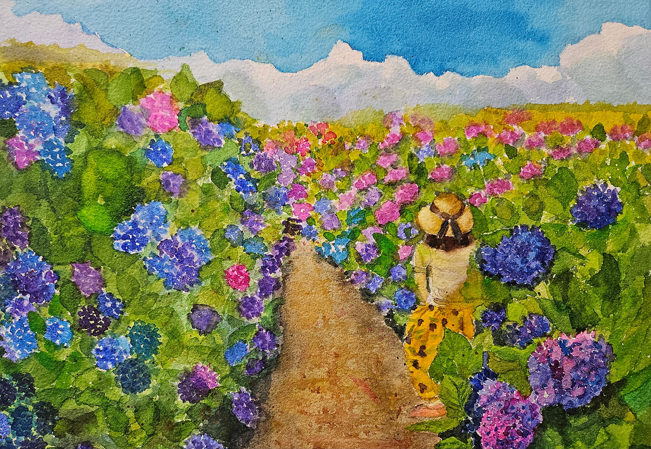 내가 수국을 워낙 좋아하니 숙소 주인장께서 카페 마노르블랑을 추천해주셨다. 과연 대형 수국길이 있는데 수국들이 영양을 듬뿍 받아 싱싱하다. 수국에 파묻혀 사진 찍기에 딱 좋다. 아래 그림과 같은 위치가 딱 좋다. 카페에서 파는 마그넷에 그려져 있는 일러스트 그림 따라 포즈를 취해 보았다. 내 그림 실력이 별로 좋지 않아서 그렇지 실물은 훨씬 이쁘다. 내 그림에는 마노르블랑 건물과 나무 한그루가 생략되었다.