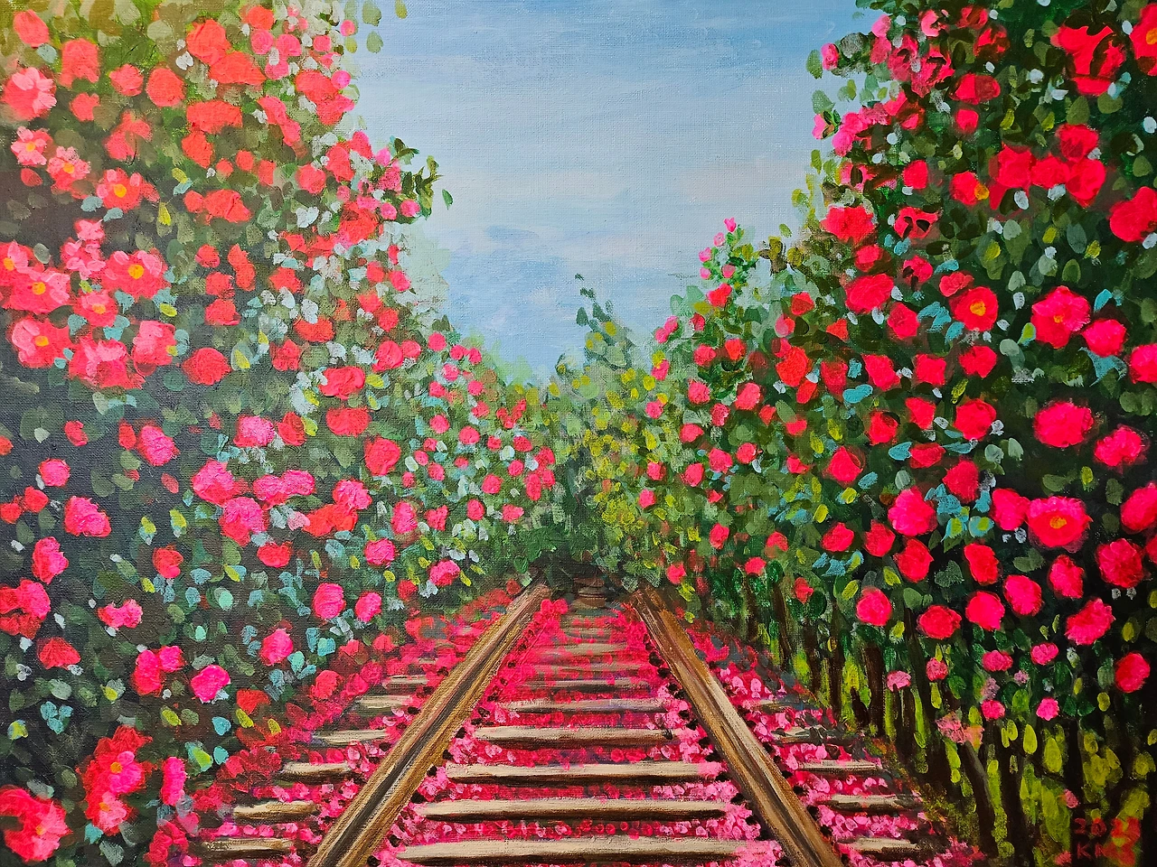 제주허브동산에서는 동백 기찻길을 볼 수 있는데 사진 배경으로도 너무 예쁘고 그림을 그려 보고 싶었다. 동백 명소가 많은데 굳이 이 곳을 방문한 것은 순전히 이 동백 기찻길을 그림으로 그려 보고 싶어서였다.