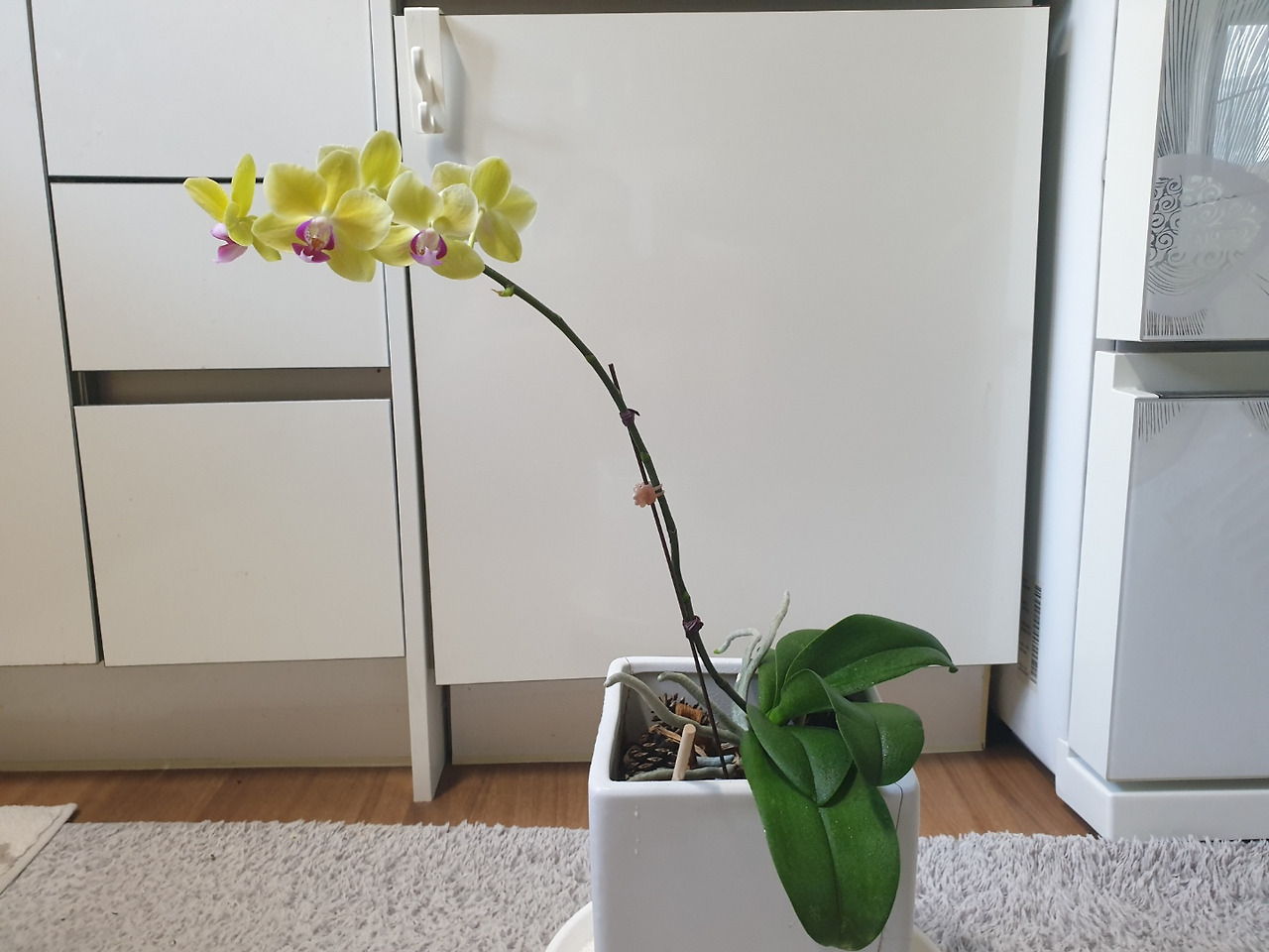 오래 전 선물 받은 노란 만천홍이 초록잎을 노랗게 만들며 오래 시무룩해 있었다. 그리고 지난 3월에 꽃대가 내밀었다. 노란 이파리를 부분부분 자르고 상처를 알콜솜으로 닦아주었다. 가느다란 꽃대가 길게 자라며 단단해지고, 그 꽃대에 작디작은 꽃망울이 돌아가며 맺히더니 어느새 5개... 첫 번째 망울이 청초하게 수선화처럼 피어난 날 오전, 남편이 모처럼 키 큰 청소기를 돌렸다. 그리고 막 펴기시작했던 노오란 꽃망울이 청소기 손잡이에 부딪쳐서 마루바닥에 떨어져있는 모습이라니...