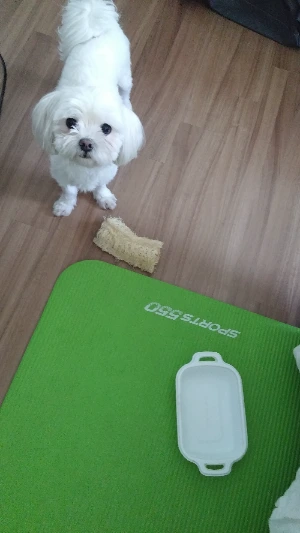 수리가 집에 온 후 첫 번째 항의 표현 (온 가족이 잠시 외출 후 돌아오니 안방 화장실의 청소도구를 꺼내서 거실 요가매트 위에 늘어놓았다. )