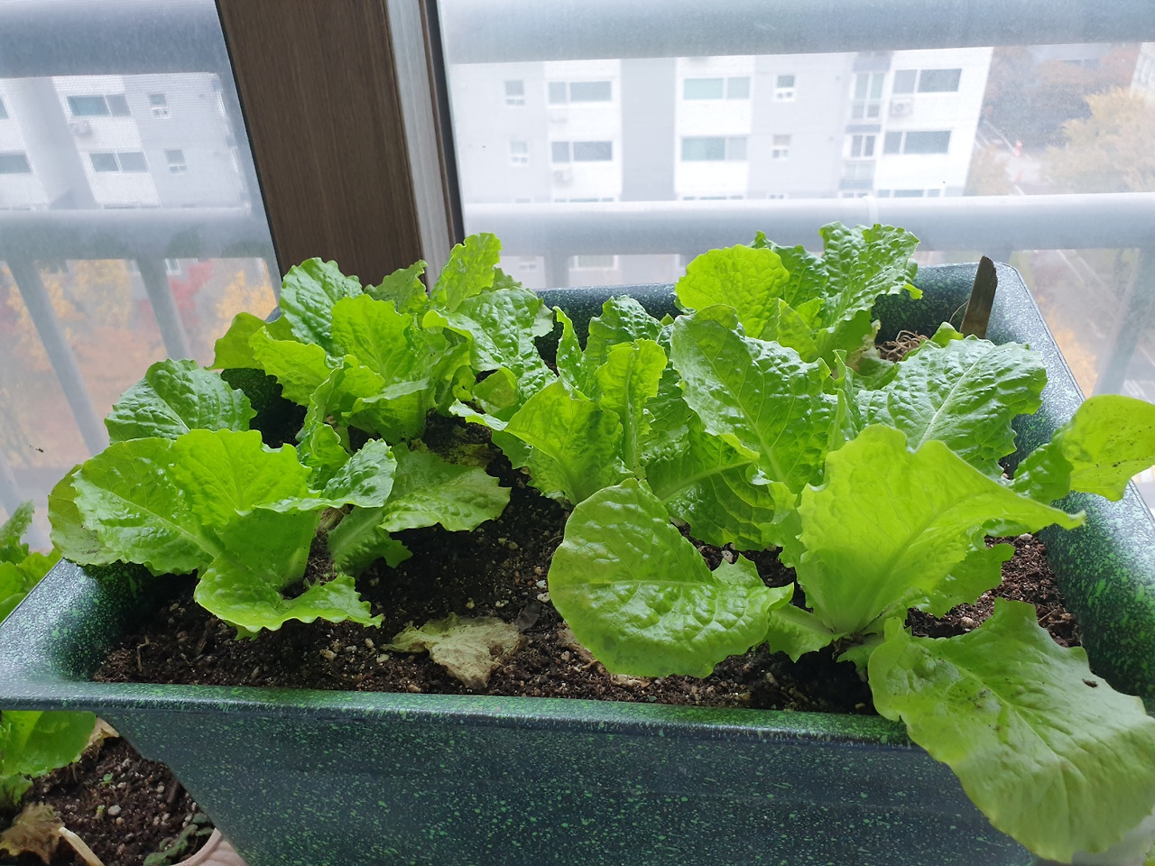 *구청에서 마련해 준 2평 텃밭에 남아있는 상추 포기들을 월동준비 차 베란다에 옮겼다. 차가운 가을 아침 상쾌한 기온의 베란다에서 초록빛 상추와의 눈 맞춤 기쁨은 덤이다.