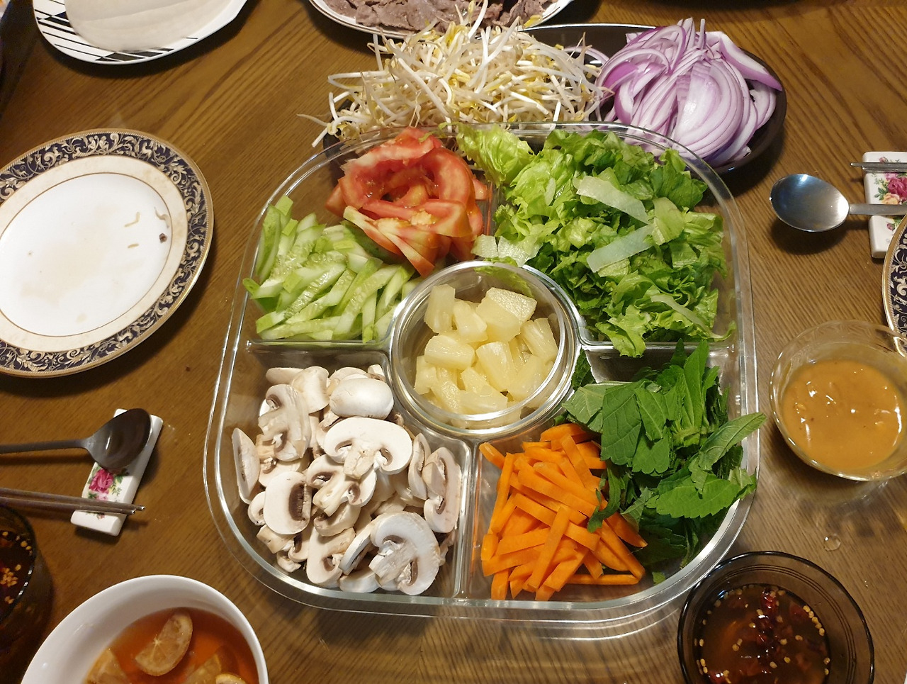 *월남쌈 준비 중. 딸의 소스는 딸이 직접 만든 땅콩소스로, 우리 부부는 레몬 피시(fish) 소스를 즐긴다.,