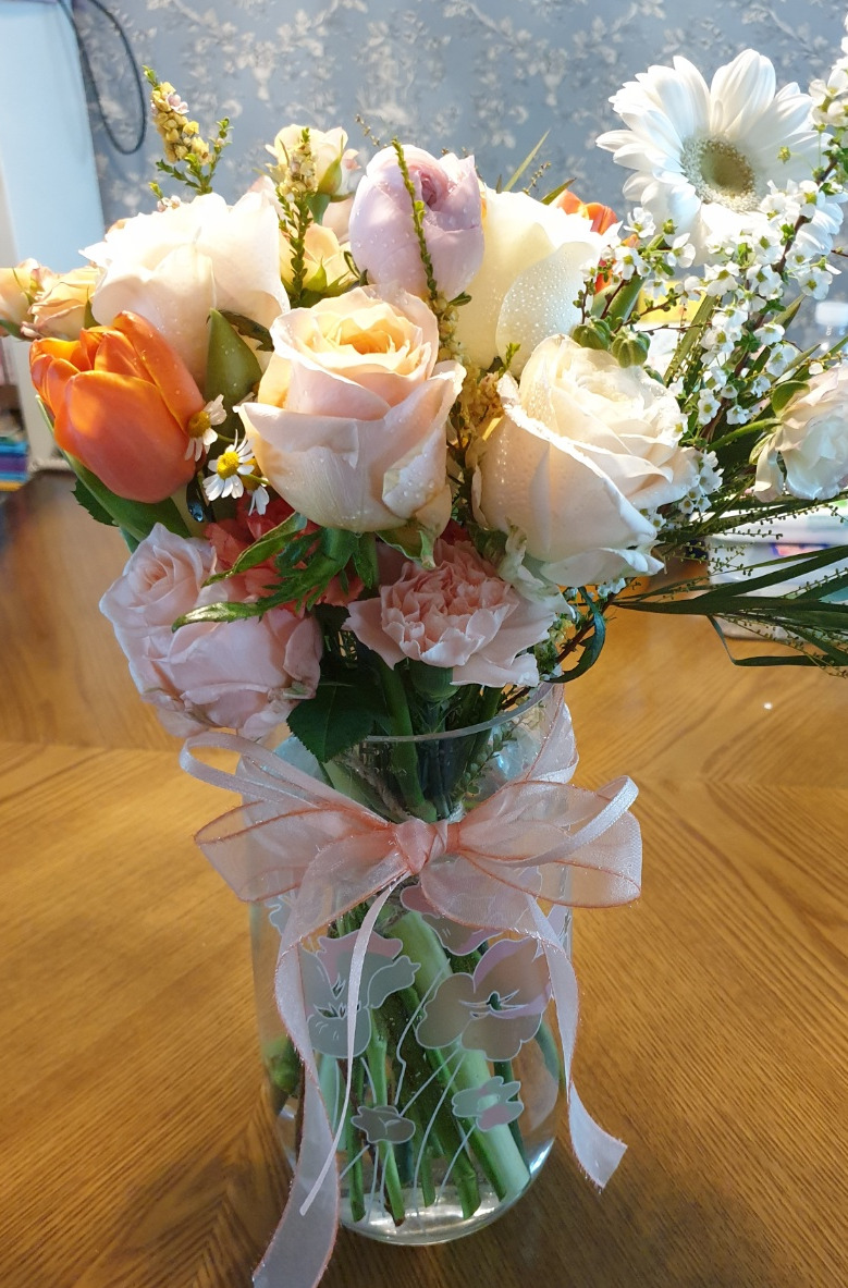 그리고 모르는 전화로부터 배달 메시지가 왔다. 이어서 연한 분홍의 장미꽃다발이 퀵서비스로 도착했다. 꽃은 <받는 순간의 기쁨>으로 그 값을 충분히 한다던 꽃집 경영 선배의 설명에 공감하는 순간이었다. 현관에서 꽃다발을 받아 들 때 번지는 그윽한 행복함이라니...