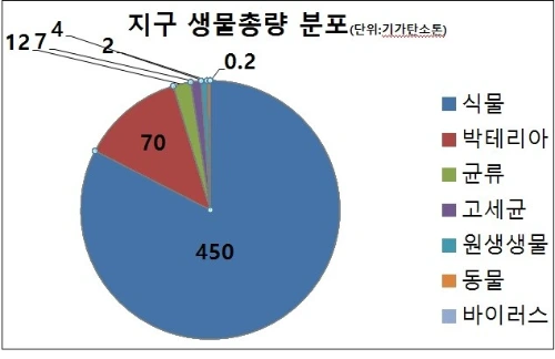 모든 생명체의 13%에 달하는 박테리아도 식물의 1/6에 불과했다. 또한 지구 표면적의 70%에 달하는 바다에 사는 바다생물량의 비중은 1% 내외이다. 즉 식물 등 대다수 생명체는 육지에 기반을 두고 있으며, 지표아래 깊이 묻혀있는 박테리아는 무려 700억 톤으로 육지생명체의 1/8에 달한다.