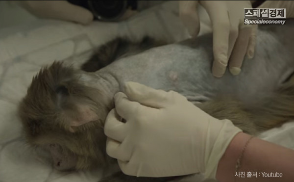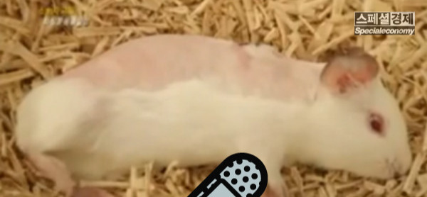 *화장품 원료를 계속 덧바르는 실험을 위해 등털이 몽땅 밀어진 기니피그(출처: 스페셜 경제 2017-08-31)