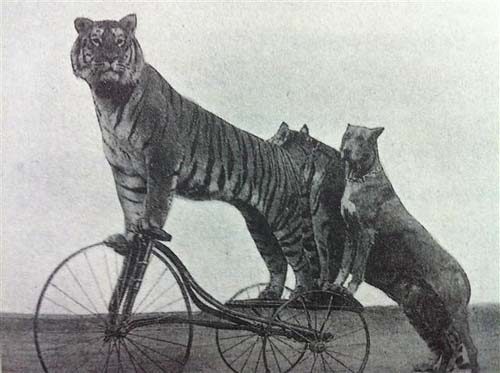 위 사진: 1893년 콜럼버스 국제박람회에서 묘기에 동원된 세발자전거를 탄 호랑이들
