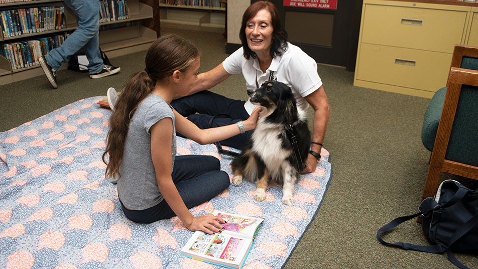 치료도우미견(therapy animals)과의 상호작용은 많은 이점이 있는 것으로 알려져 있다. 즉 또래와의 사회적 기술 향상, 스트레스와 불안 감소 및 엔도르핀 증가를 가져온다. 또한 아이들은 교실에 함께 머무는 개로 인해 집중력과 자신감이 향상됨을 경험할 수 있다. 특히 소리 내어 책을 읽기에 종종 부끄러움을 느끼거나 주저하는 아동들의 태도는 자연스러움에도 불구하고 위축되기 쉽다. 이때 아동들은 읽기 도우미견에게 소리 내어 읽어주면서 자신 옆에서 귀를 기울여주며 엎드려있는 교실의 반려견(dog in the classroom)으로 인해 편안함을 느끼는 것으로 나타났다.