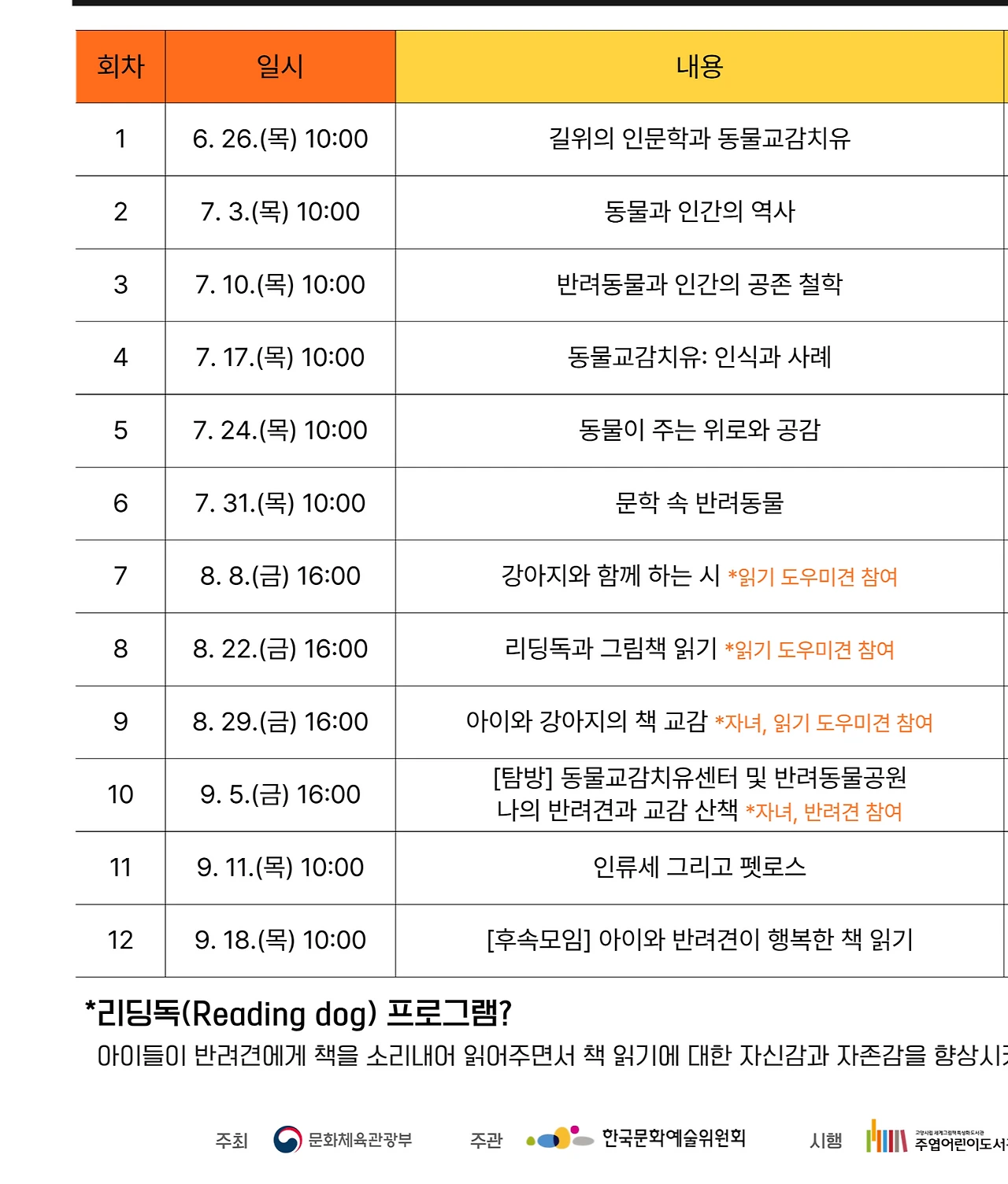 제목으로 "리딩독 Children Reading to Dogs" 프로그램을 여름(6.26. 목)부터 가을 입구(9.18. 목)까지 12주 동안 회당 2시간에 걸쳐 진행할 예정입니다.