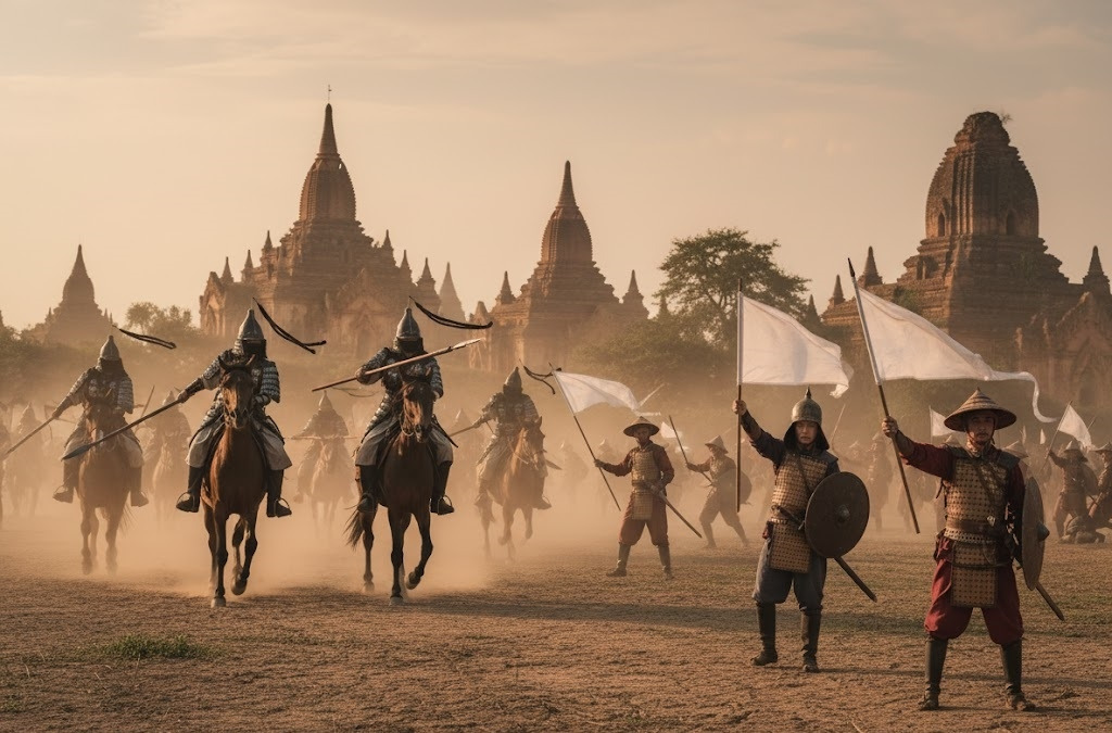 대원제국(원나라)군 장창기병대가 동남아시아 미얀마를 침략하자 미얀마 병사들이 백기를 들고 항복하는 모습