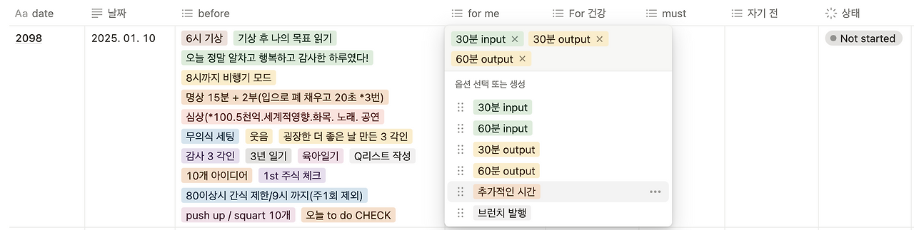 1번 습관은 했는지 안 했는지 확인할 수 있는 방식의 기록이 좋다. 나는 노션을 활용 중이다. 아래 이미지와 같이 오늘이 몇 번째로 습관을 유지하고 있는지, 오늘 날짜가 언제인지 정리했다. 그리고 각 습관들을 하루 일과에 따라 분류를 나눴다. 진행을 하면 항목을 클릭하면, 바로 기록에 남아 편하다. 매일 단위로 내가 관리하는 습관이 몇 가지 진행했는지 살펴볼 수 있다.