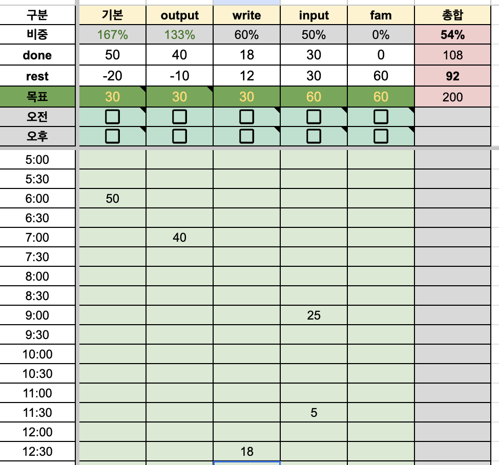 하루에 30분 이상 책 읽기, 60분 이상 글쓰기와 같은 항목들을 실제로 관리할 때 활용한다. 매일 정해진 시간에 책을 읽거나 글을 쓸 수 없기 때문에 하루 단위로 엑셀을 활용하고 있다. 매일 습관으로 하고 있는 행동의 목표 시간을 적어놓고, 실제로 틈이 날 때 시계로 시간을 잰다. 그리고 내가 하루에 실제로 투자한 시간을 기록에 남긴다. 그리고 목표로 한 30분, 60분을 완성하면 1번의 양식에 표시한다.