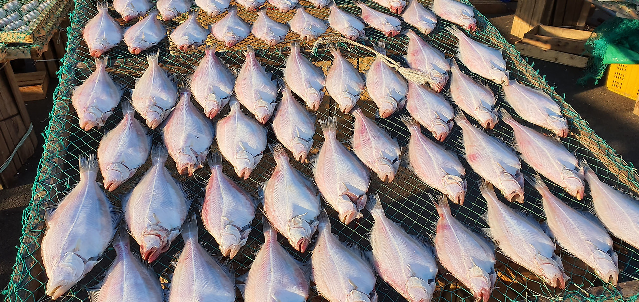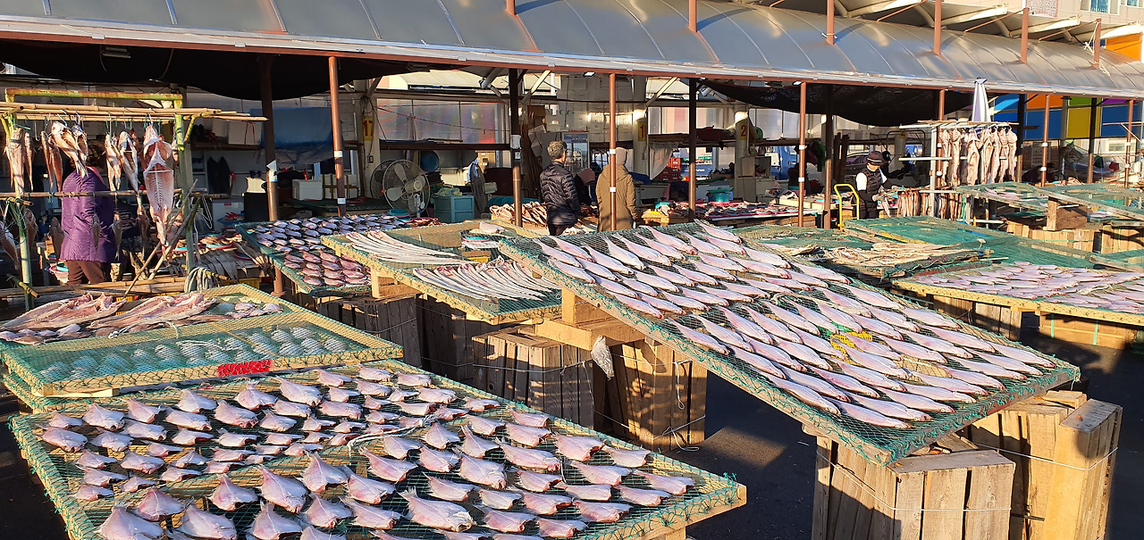 방어진항의 어물전 앞에 널어 말리고 있는 생선들