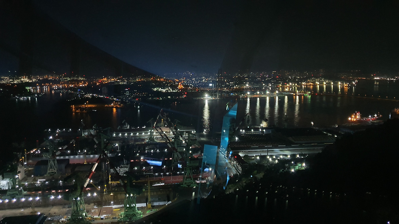 울산대교 전망대에서 바라본 울산항의 야경(좌)과 봉수대에서 발견된 몽돌 안내판(우), 투석용으로 사용했다는데 왠지 애잔한 느낌이 든다. 대왕암의 해국(방어진체육공원입구교차로-소리체험관-대왕암-일산해수욕장)