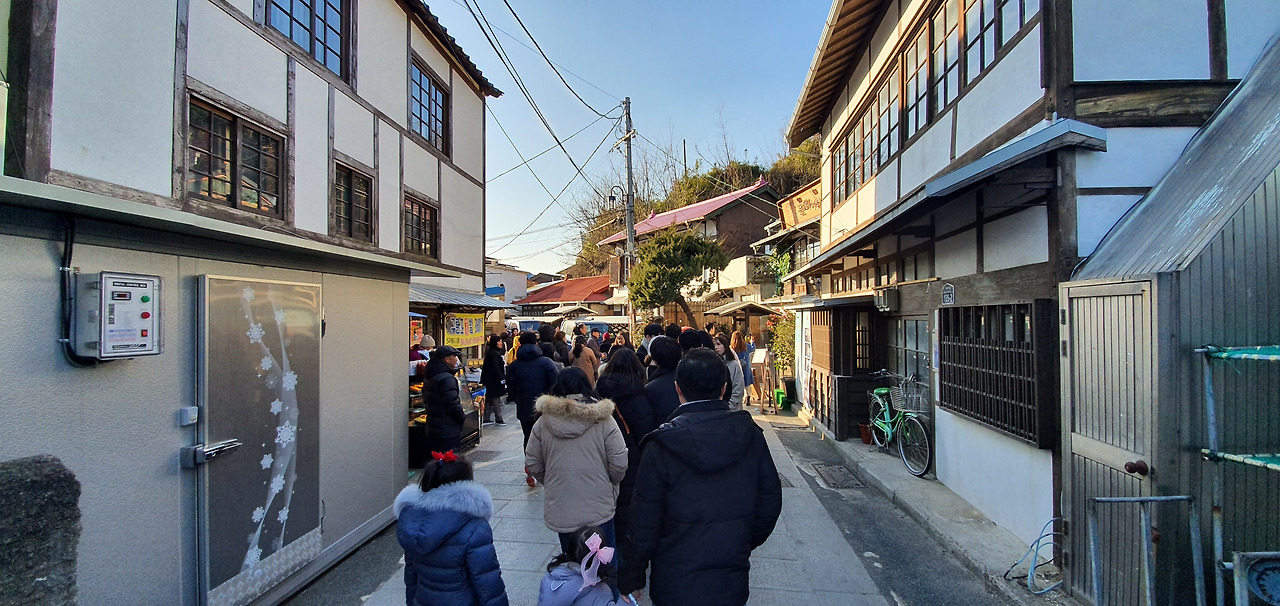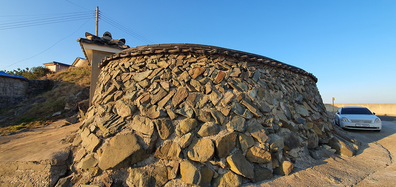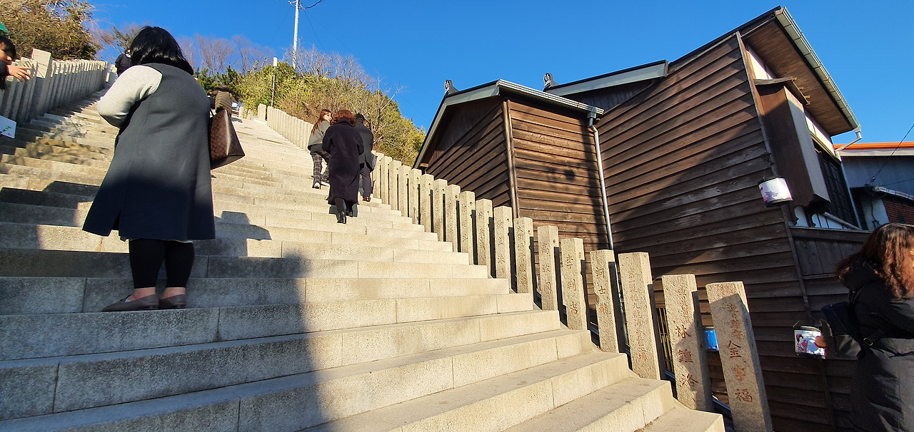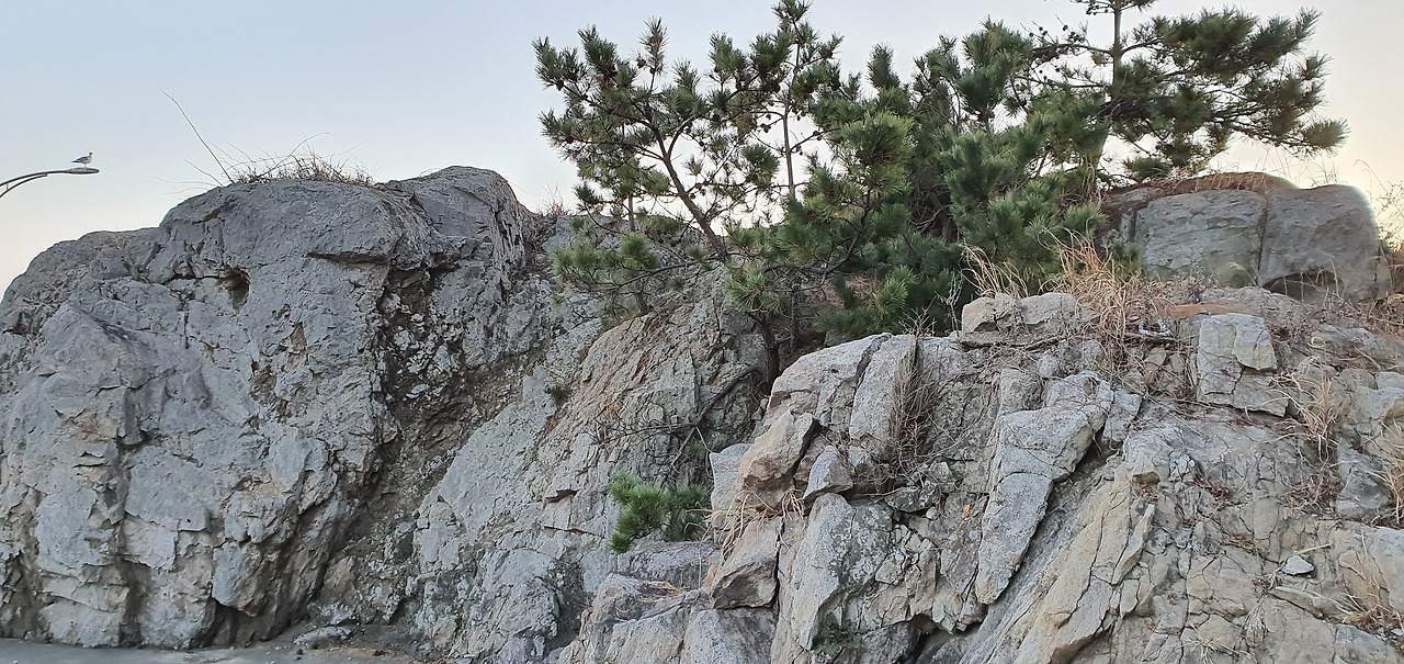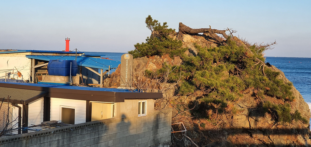 구룡포 주상절리는 축포를 쏘듯 위쪽으로 향해있다. 주상절리가 형성될 때의 상황을 그려볼 수 있게 해주는 모습이다. 주상절리의 모습이 절경을 이루지만 이미 여러 차례 주상절리를 보고 오는 길이라 그런지 차가운 바람 부는 전망대에 오래 머무르지는 않는다. 마음속의 남은 거리와 오늘 집으로 가려는 생각이 발걸음을 재촉하기 때문이기도 하다. 길을 걸을 때 나름 즐기리라 했는데 벌써 코스에 연연한다. 일정을 맞춰 빨리 걸으려 하고, 쓱 지나치는 것도 꽤 많다. 갈매기 가득한 삼정해변을 거쳐 삼정 3리에 이르자 그림자가 길게 늘어진다. 그래도 서낭당이 나오니 열심히 돌아본다. 구룡포 포스코수련원 앞에 있는 서낭당은 돌담장과 기와지붕이 마치 옛집처럼 보인다. 두일포마을에는 작은 바위 위에 가지를 아래로 늘어뜨린 소나무가 발걸음을 멈추게 한다. 나무들을 집 안의 화분에 키우며 작은 자연을 구상하는 분재에서 이 같은 작품을 현애(懸崖)라고 한다. 벼랑에 매달려 가지를 늘어뜨린 나무라는 뜻이다. 그런데 재미있는 건 이 나무 아래에 있는 기념비이다. 예비군 휘장이 비에 새겨져 있고 전국 최우수 예비군 소대라는 글이 쓰여 있다. "아, 저런 게 있었구나." 나도 예비군 훈련을 받긴 했는데 저런 게 있으리라고는 생각을 못했다. "기념비를 세울만하지. 끄덕끄덕"