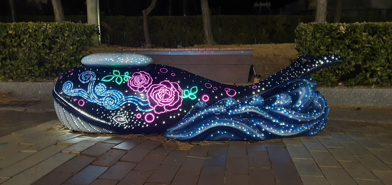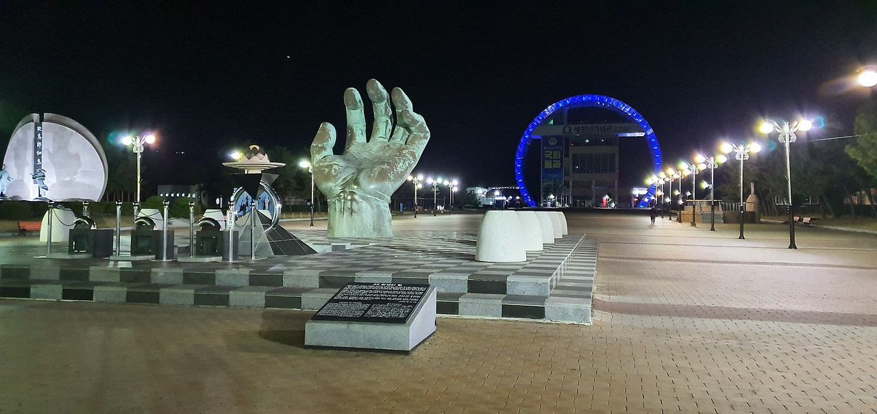 얼마나 걸었을까. 밤길에서는 걷는 속도도 빨라진다. 주변에 한눈을 파는 일이 없으니 자연스레 속도가 올라갈 수밖에 없다. 멀리 호미곶의 등대가 사방을 비추는 것이 보인다. 목적지가 눈에 보이니 속도를 더 내게 된다. 조명을 받는 상생의 손 앞에 서니 성취감이 든다. '어쨌든 열심히 걸어왔다.' 버스를 타러 나오며 보니 새천년 기념관으로 가는 광장엔 장미꽃이 등에 반짝이는 고래며 화려하게 색을 바꾸는 문어가 나를 반긴다. 그런데 버스를 기다리는 데 막차시간이 되었는데도 차가 오지 않는다. 고민하다 택시를 부르려 전화를 거는데 20분 정도 늦게 다른 버스가 온다. 어렵게 구룡포까지 나왔는데 이곳에서는 몇 분 전에 막차가 끊겼다. 할 수없이 택시로 포항역까지 이동한다. 이럴 줄 알았으면 호미곶에서 택시를 타고 직접 가는 건데. 항상 일이 잘 풀릴 수는 없는가 보다. 그래도 택시 덕분에 마지막 열차를 놓치지 않았다. 잠깐 남는 틈새에 가락국수 한 그릇으로 저녁을 먹는다. "그래도 끼니를 거르지 않았고 욕심껏 걸었으니 오늘도 성공한 거다. "