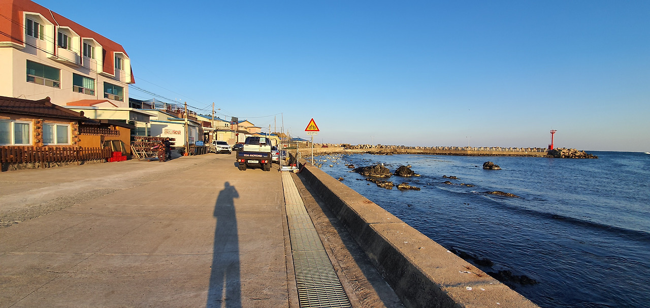 석병리의 해안을 걸을 때 뒤를 돌아보니 해가 빛을 잃고 떨어지고 있었다. 석병리 양어장의 물이 배출되는 곳에는 갈매기들이 떼를 이루어 물을 보고 있다. 양어장을 탈출해 나오는 물고기들이 이들에겐 손쉬운 먹이이다. 만일 물고기들이 빠삐용이나 쇼생크 탈출의 앤디처럼 양어장을 탈출한다면 그들에겐 더 큰 위협이 기다리고 있는 것이다. '참 서글픈 일이다.' 양어장을 지나며 잠시 쉬는데 양말의 뒤쪽이 떨어져 구멍이 났다. 어째 발뒤꿈치의 감촉이 계속 안 좋더라니. 걸으면서 벌써 여러 개의 양말이 떨어졌다. '너무 걷는데만 열심이었나?'