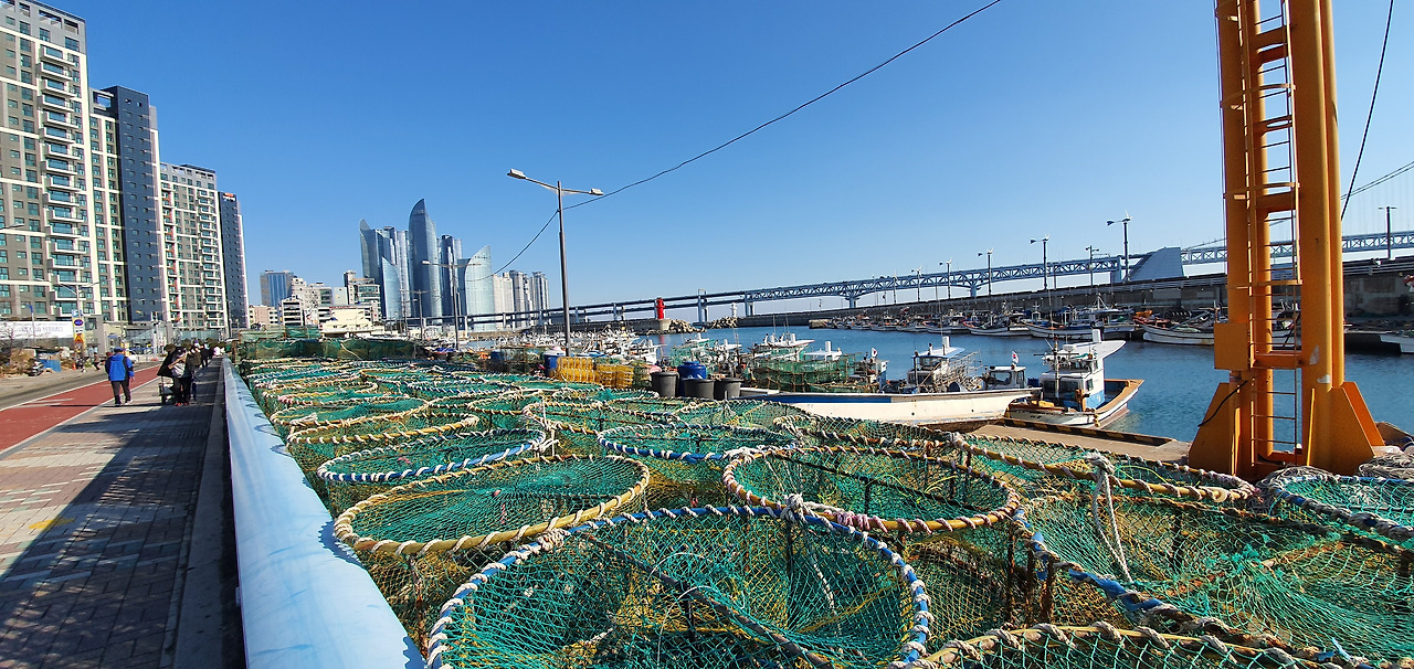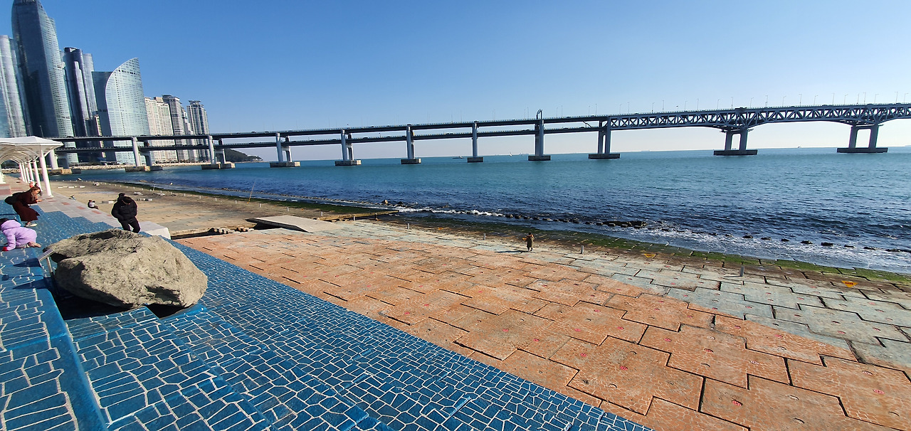 해파랑길 1코스를 걸을 때는 주로 용호부두의 횟집에 들러 제대로 된 식사를 한다. 물회와 매운탕을 함께 제공하는 이곳의 식당들은 어느 곳을 들어가든 만족한 식사를 할 수 있다. 시장이 찬이라고, 적당히 걷기까지 했으니 굳이 맛을 따질 필요도 없지만 말이다. 오늘은 김밥을 먹어 그런지 배가 고프지 않아 그냥 통과한다. 하늘을 찌르는 주상복합 아파트 단지 앞을 지나는 길엔 노란 피라칸사스 열매와 분홍색의 개량종 동백, 먼나무 붉은 열매가 겨울을 잊은 듯하다. 광안대교가 시작되는 곳에 있는 분포교는 전어를 낚는 낚시꾼들이 북적대던 곳이었는데 아무도 없다. 현재 이곳의 다리 난간엔 화분을 놓아 아예 낚시를 할 수 없게 만들어 놓았다. 낚시를 하며 도로 위로 낚싯줄과 물고기가 튀는걸 몇 번 보았는데 아마도 교통사고 위험 때문에 금지시켜 놓은 것 같다. 이제는 광안리 해수욕장에 있는 해양레포츠센터 오른쪽의 제방이 꾼들의 모임터가 되었다. 그들이 낚시를 그만 둘리는 없다. 남천항을 지나 삼익비치타운 아파트 옆을 지날 때는 제방과 단조로운 길이 이어진다. 봄이면 왕벚나무가 꽃의 축제를 여는 아파트 화단에는 동백나무의 흰꽃이 유난히 두드러져 보인다. 사람들은 어디서고 또 다른 생명이 있어야 안심하는 본능이 있어 나무를 심고 숲을 만든다. 놀이터에 나와 앉은 노인들은 과거를 추억처럼 이야기 나눈다.