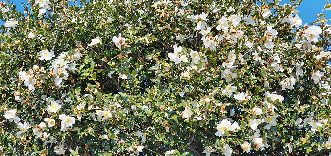 용호부두 옆 피라칸사스와 동백나무 울타리와(좌) 흰꽃을 가득 달고 있는 동백나무. 처음에는 차나무가 아닌가 했다(우).