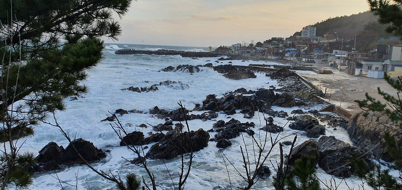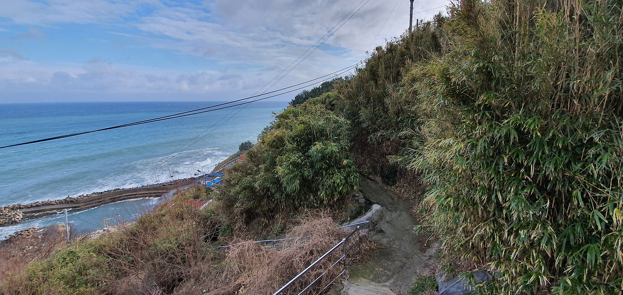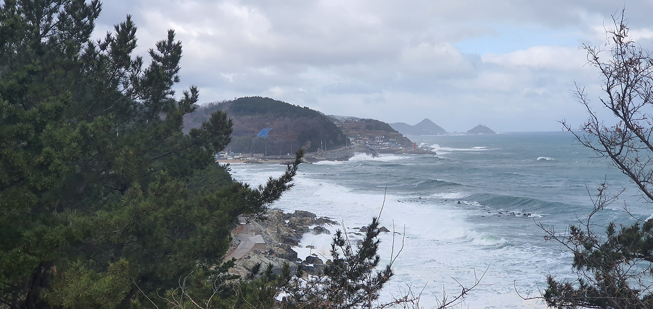 경정 2리로 들어가는 입구에서 길이 막혀 있고 이전의 통행로 위에 흙을 성토해 놓아서 길이 어지럽다. 길이 이렇게 된 내막을 모르는 걷기여행자들은 그저 툴툴거리며 조심해서 길을 계속 갈 수밖에 없다. 차유항을 지나 축산천 하구까지 이어진 해안 절벽길로 들어서는 마을 입구 도로로 파도가 밀려 들어온다. 어둑해져 가는 시간이 되니 파도가 더욱 거칠어진다. 오늘 이 마을은 이곳저곳 걷기여행자의 발길을 잡는 것이 많다. 소금기가 만든 회갈색 포말을 지나 산길로 오르니 좀 전까지 길을 방해했던 파도가 아름다운 경관이 된다. '역시 보는 것과 가는 것은 차이가 크다.'