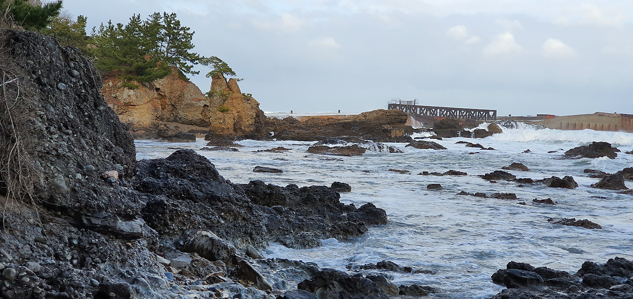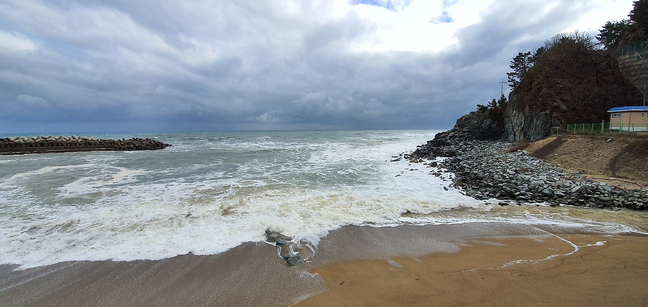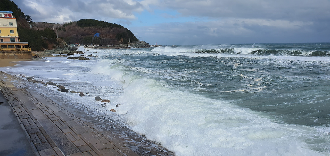 조금씩 내리는 비이지만 여러 시간을 걷는 걷기여행자에겐 꽤나 피곤한 길이다. 그동안 바람에 단련이 되어 요령이 생긴 것인지, 어제 강구항에서 산 우산이 좋은 것인지 바람에 우산이 뒤집히는 횟수는 훨씬 줄어들었다. 그래도 오늘 역시 바람이 만만치 않은 날이어서 대탄리까지는 도로를 따라 걷는다. 이번에도 이럴 경우 군시설과 약속 바위를 비롯한 영덕의 화강섬록암이 만들어 놓은 여러 종류의 바위를 보지 못하고 지나쳐야 하지만, 아쉬워도 감수해야 한다. 흙이 흘러내린 도로의 사면이 기상의 상태를 대신 이야기해준다. 대탄리에서 바다와 마주하니 거친 파도가 가라앉을 기색이 없다. 오늘은 내내 파도의 눈치를 보며 걸어야 할 것 같다.